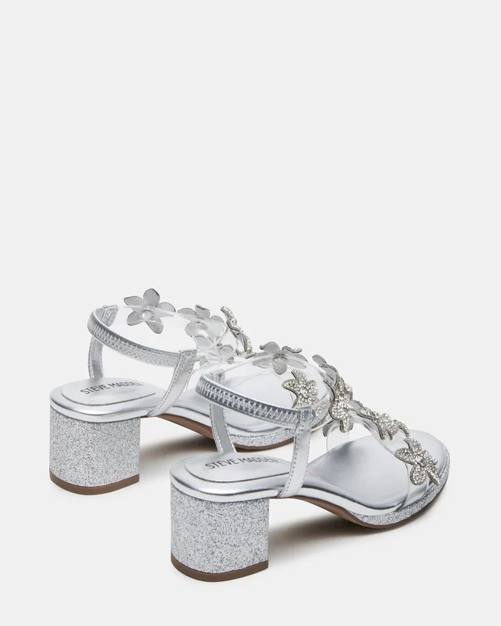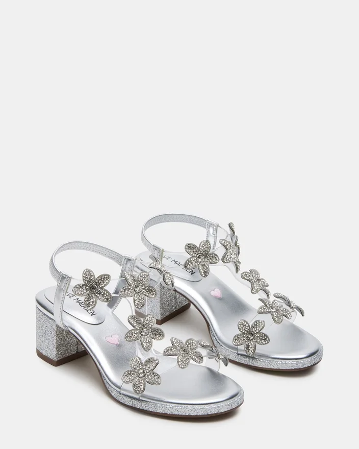 Kids’ Savvy är expertdesignad för komfort och stil och har remmar runt hälen samt en blockklack som ger stabilitet och stöd. Dekorationerna med strassblommor tillför en glittrande touch, vilket gör den till det perfekta valet för ditt barns speciella tillfällen.