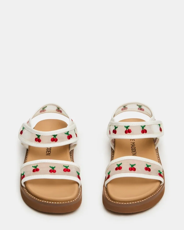 Vi presenterar Lyla White för småbarn – en lekfull sandal med fotbädd designad för små upptäcktsresande. Med charmiga broderade körsbärsdetaljer och en ventilerande meshkonstruktion håller denna sandal de små fötterna bekväma hela dagen. De justerbara kardborrebanden säkerställer en säker, anpassningsbar passform som växer med ditt barn. Perfekt för äventyr i varmt väder, från dagar i parken till vardagsstils utflykter.