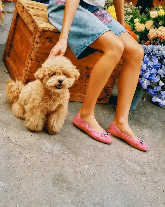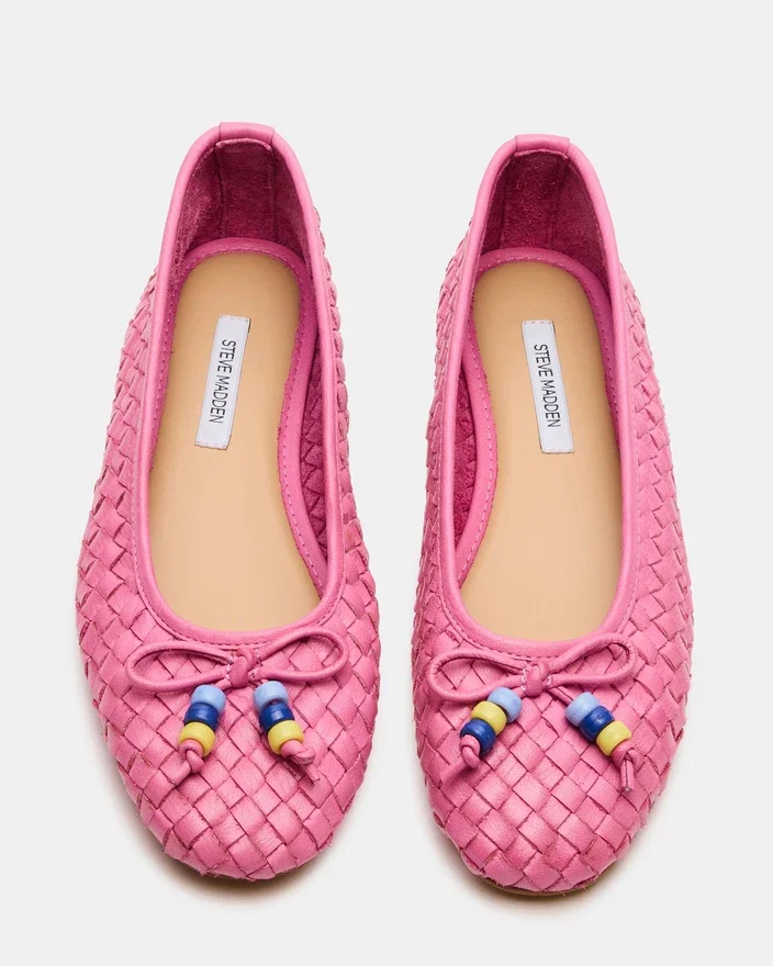 Divy-ballerinaskorna i rosa läder visar upp raffinerat hantverk med sin vävda konstruktion och graciösa rosett. Denna design med rund tå balanserar minimalistisk estetik med funktionell elegans, vilket gör den till ett perfekt val för dig som söker en mångsidig ballerinasko som smidigt passar alla tillfällen. De texturerade vävda detaljerna tillför visuellt intresse samtidigt som de bibehåller den diskreta sofistikation som ballerinaskor är kända för.