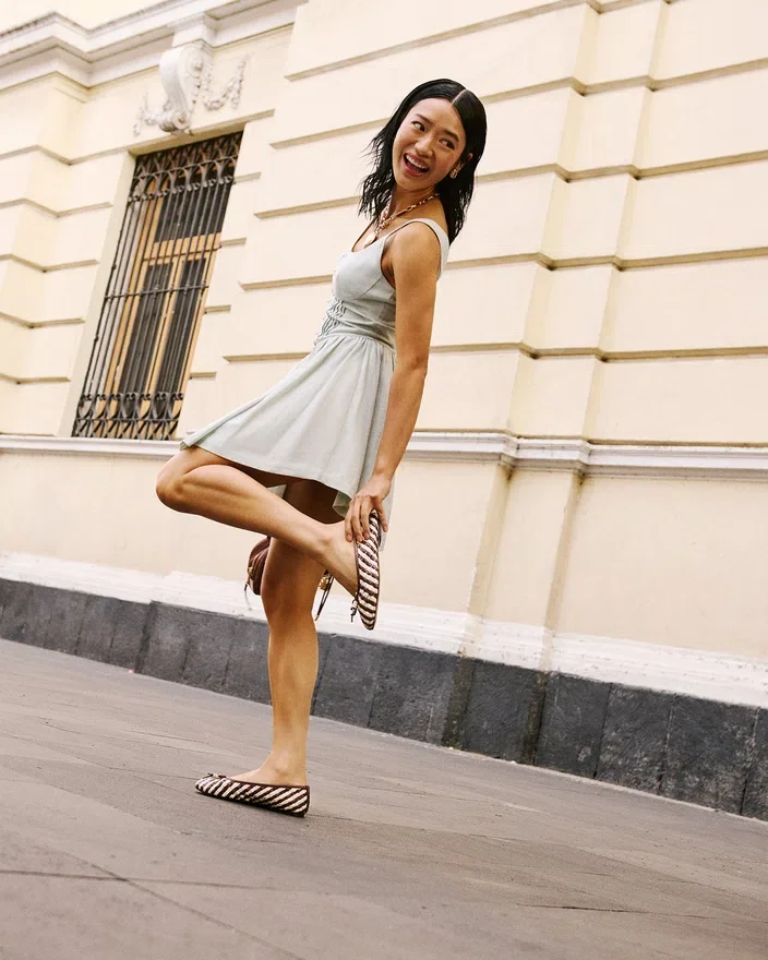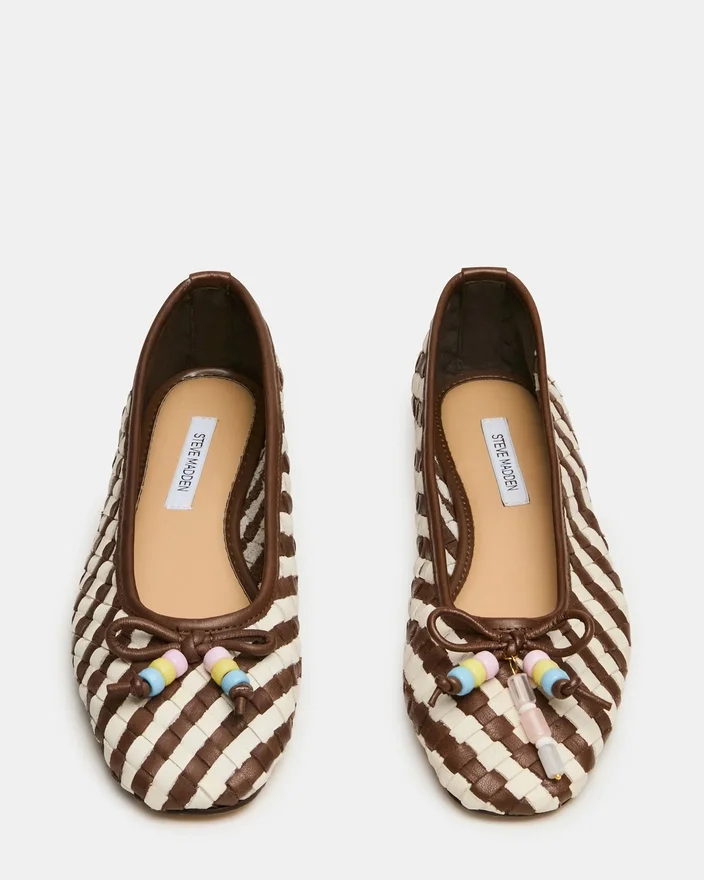 Divy-ballerinaskorna i vitt/brunt läder visar upp raffinerat hantverk med sin vävda konstruktion och graciösa rosett. Denna design med rund tå balanserar minimalistisk estetik med funktionell elegans, vilket gör den till ett perfekt val för dig som söker en mångsidig ballerinasko som smidigt passar till alla tillfällen. De texturerade vävda detaljerna tillför visuellt intresse samtidigt som de bibehåller den diskreta sofistikation som ballerinaskor är kända för.