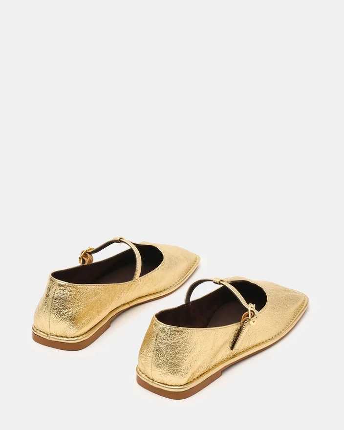 Macbeth Gold Leather kombinerar tidlös elegans med modern design. Med en distinkt silhuett med fyrkantig tå och raffinerade T-remmar erbjuder denna modell både sofistikation och komfort. Den platta konstruktionen ger en strömlinjeformad profil som är perfekt för övergången från dag till kväll, medan den strukturerade tån och den stödjande remmen säkerställer en säker och elegant passform.