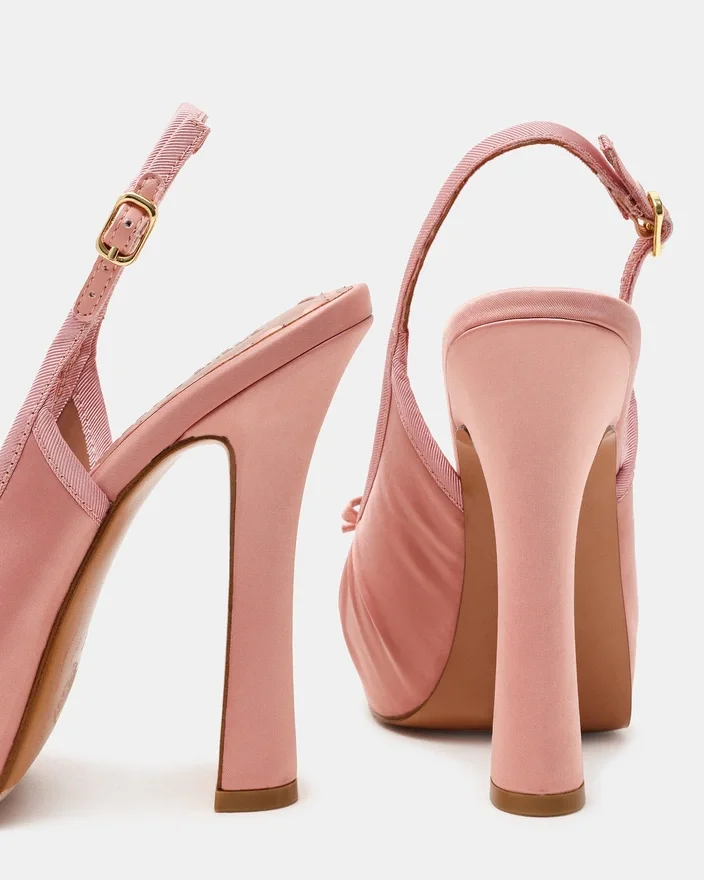 Lyft din look med Sofie Blush Satin Slingback, en sofistikerad ballerinasko med klack prydd med en rosett. Den strukturerade plattformen ger stabilitet och komfort, medan den raffinerade klackskorna ger omedelbar elegans till vilken outfit som helst. Denna modell övergår sömlöst från dag till kväll och erbjuder den perfekta balansen mellan elegans och bärbarhet.