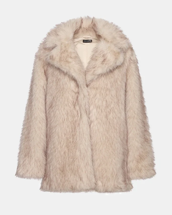 Kindra-kappan är en lyxig jacka i fuskpäls som är designad för att ge värme och stil under de kallare årstiderna. Den mjuka texturen ger ett sofistikerat utseende samtidigt som den garanterar komfort och värme. Denna kappa är perfekt för att lyfta vilken outfit som helst och kombinerar expertis inom hantverk med etiska material för ett elegant, djurvänligt ytterplagg.