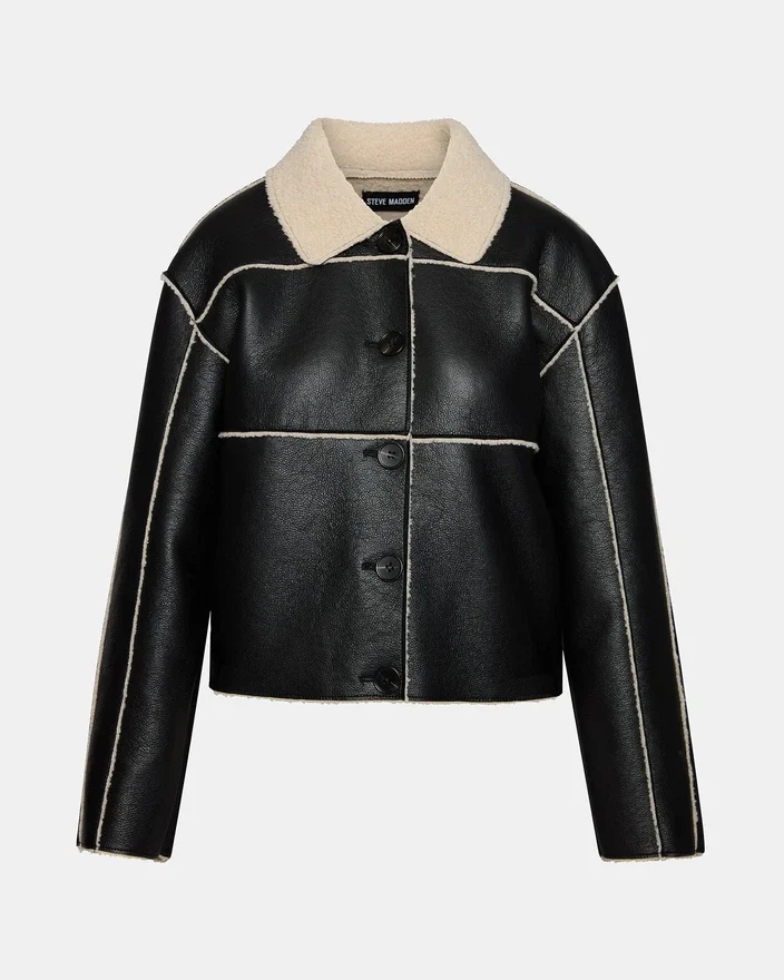 Tilia-kappan kombinerar sofistikerad design med praktisk värme. Med en långärmad silhuett och en lyxig krage i fuskpäls erbjuder denna jacka i imitationsläder både stil och komfort.