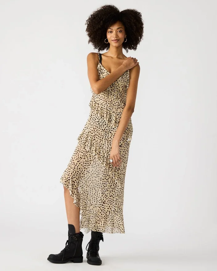 Denna Aida-klänning har ett flödande volangdesign och V-ringning, perfekt för en bekväm och stilfull look. Den långa längden och den ärmlösa designen ger mångsidighet och andningsförmåga. Tillverkad av högkvalitativa material är denna klänning ett måste för alla modemedvetna som letar efter ett statement-plagg i sin garderob.