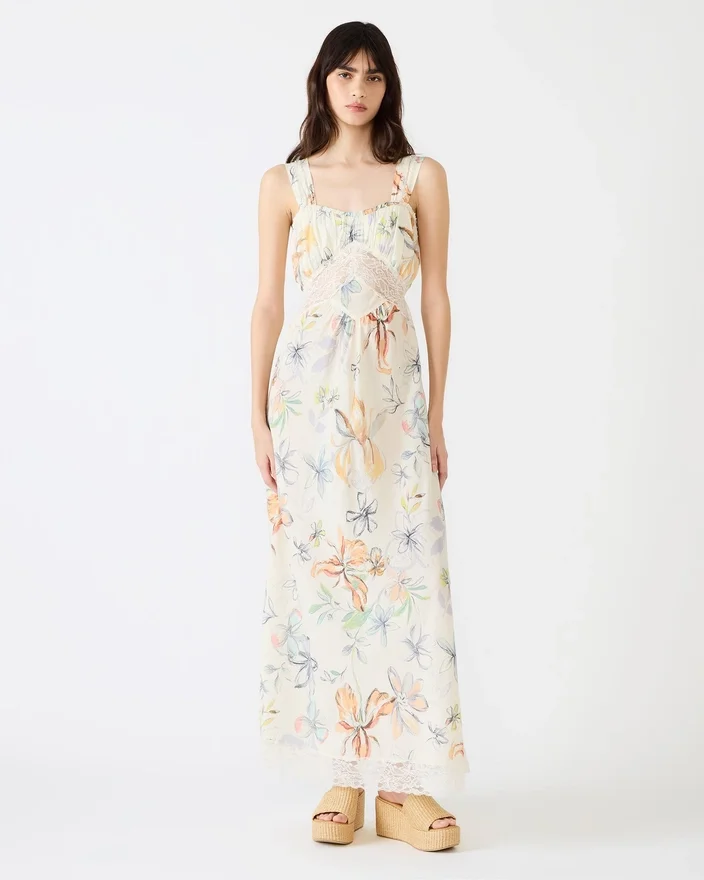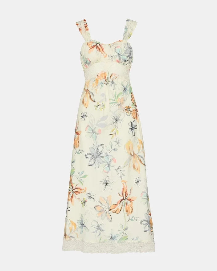 Omfamna avslappnad elegans med Alexus-klänningen Vintage Ivory. Denna maxiklänning utan ärmar har en graciöst flödande design som rör sig med dig, kompletterad med delikata spetsdetaljer. Det romantiska blommönstret tillför tidlös sofistikation, medan en dekorativ rosett pryder ryggen för en oväntad pricken över i:et.