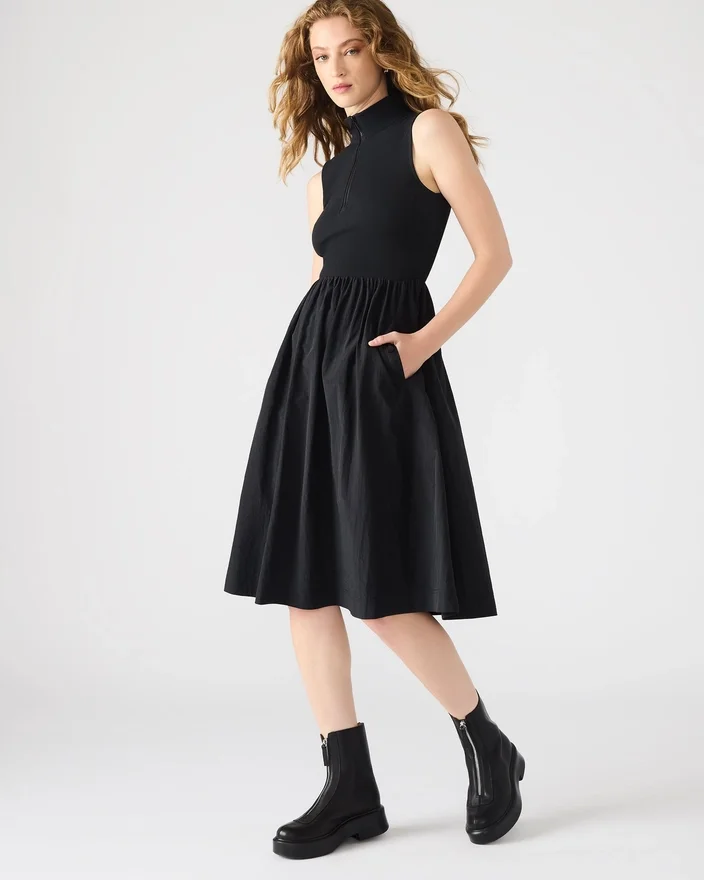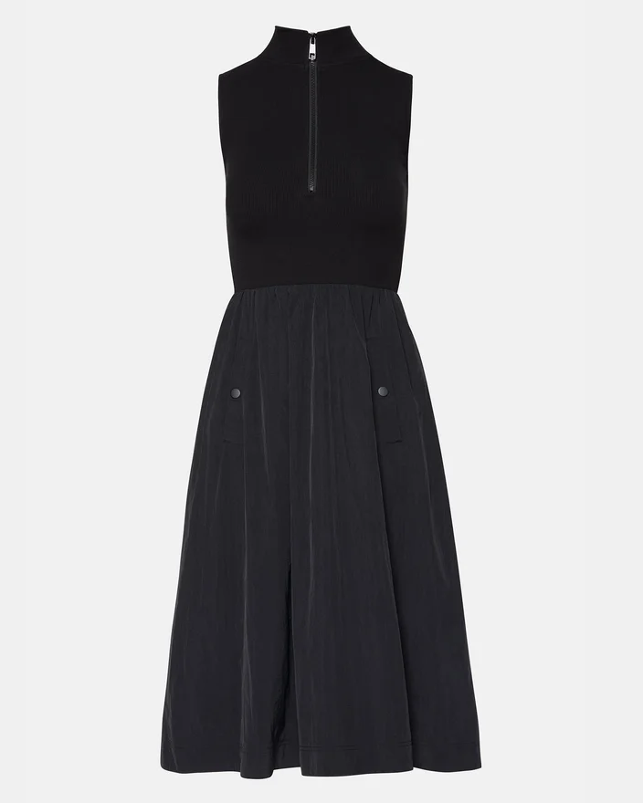Berlin-klänningen är ett mångsidigt och elegant tillskott till varje garderob. Med en stilfull kombination av en ärmlös stickad överdel och en A-linjeformad nylonkjol är denna midilånga klänning både bekväm och moderiktig. Perfekt för våren, med dragkedja fram, hög hals och fickor med tryckknappar för extra funktionalitet. Lyft din stil med denna midiklänning.