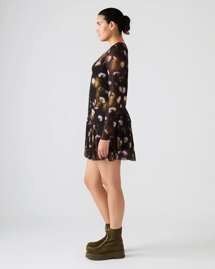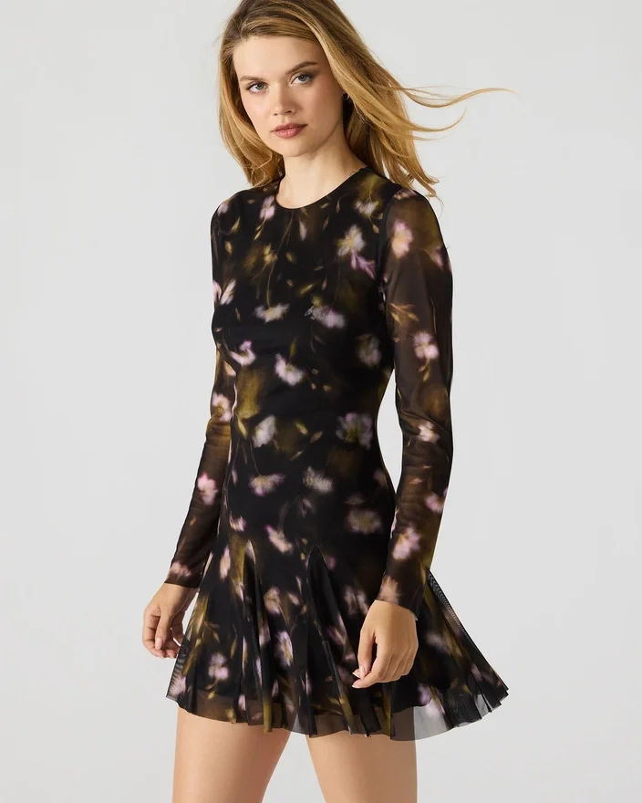 Förbättra din garderob med Bliss-klänningen i svart med små blommor, med en smickrande minilängd och en flödande silhuett som rör sig obehindrat. Denna klänning har delikata, genomskinliga långärmade ärmar i mesh för en subtil, modern touch, medan det intrikata svarta blommönstret tillför tidlös, feminin charm.