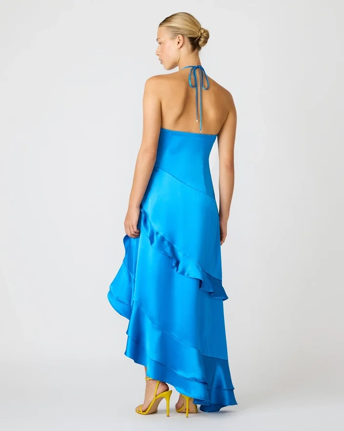 Caspia-klänningen i blått har en sofistikerad silhuett med hög halsringning och flödande maxilängd. Detta iögonfallande plagg har en asymmetrisk design som förstärks av volanger som tillför rörelse och dimension. En praktisk dragkedja i sidan säkerställer en bekväm passform samtidigt som klänningens eleganta linjer bevaras. Perfekt för att göra ett djärvt intryck vid alla tillfällen.