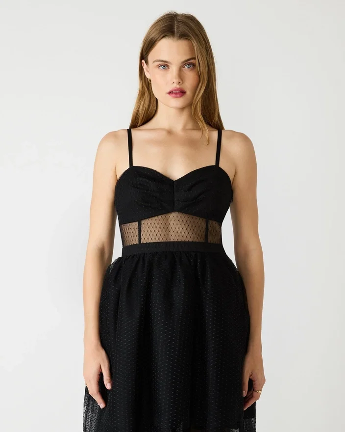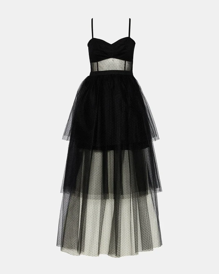 Gör entré i denna sofistikerade svarta Emily-tyllklänning, designad med ett elegant mittparti i mesh som ger visuellt intresse och dimension. De justerbara axelbanden ger en anpassningsbar passform, så att du kan hitta din perfekta silhuett för kvällen. Denna klänning är tillverkad av premiumtyll och ger den volym och rörelse som förväntas av en uppseendeväckande festklänning. Perfekt för skolbal, galor eller andra formella tillfällen där tidlös elegans är avgörande.
