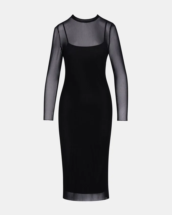 Hailee-klänningen är en sofistikerad midilång klänning tillverkad av genomskinligt nätmaterial, med långa ärmar och en elegant hög hals. Designen balanserar elegans med en modern touch, vilket gör den idealisk för stilfulla kvällsevenemang eller exklusiva sammankomster. Det andningsbara nätmaterialet garanterar komfort samtidigt som det bibehåller en elegant silhuett, vilket ger ett självsäkert och polerat utseende.
