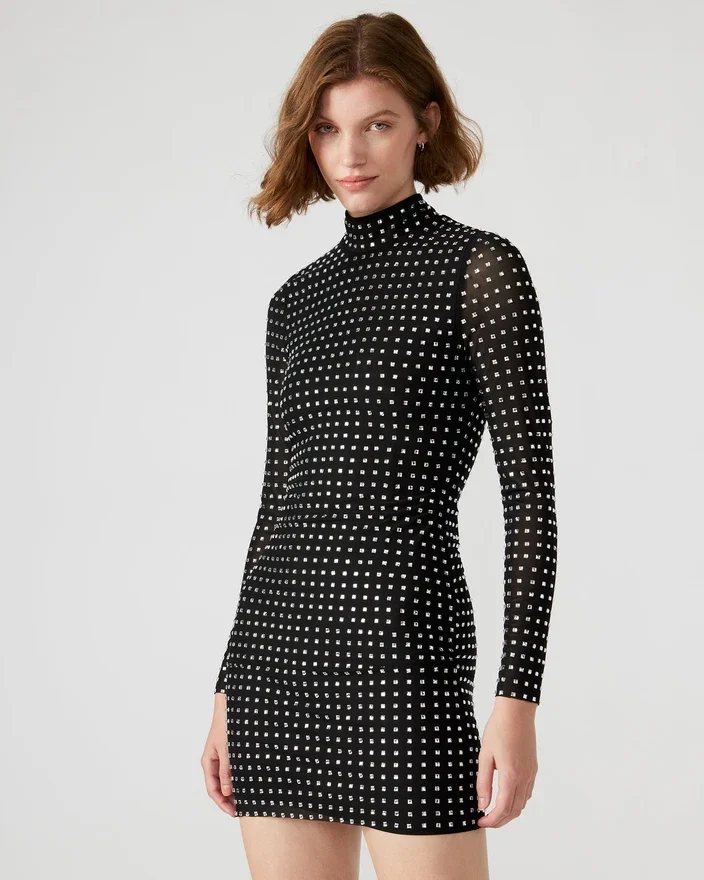 Lyft din stil med vår Krista-klänning. Denna långärmade miniklänning har en hög hals och dragkedja bak. Denna fantastiska klänning har också unika fyrkantiga strassdekorationer som ger en touch av glamour. Gör intryck med detta eleganta och sofistikerade plagg, perfekt för alla tillfällen.