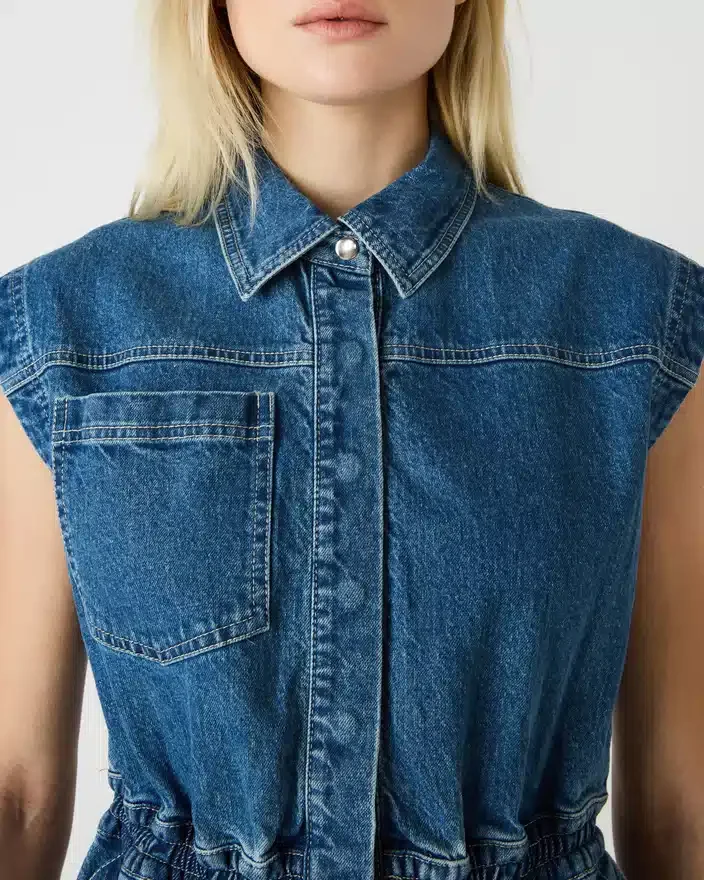 Robbie-klänningen i Aruba Blue kombinerar tidlös denimkonstruktion med modern mångsidighet. Denna ärmlösa modell har en klassisk dragkedja framtill och en elegant krage som ger ett elegant intryck. Praktiska framfickor gör den användbar i vardagen. Det strukturerade denimtyget garanterar lång livslängd, medan den smidiga silhuetten smidigt passar både i vardagsstil och på festligare tillfällen.