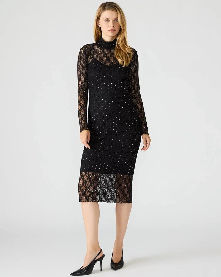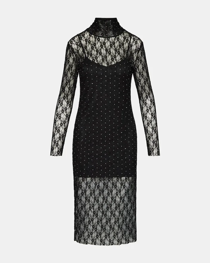 Den svarta spetsklänningen Vivienne med nitar har ett fodrat ytterlager i genomskinligt nät i midilängd, avslutat med en hög hals och ärmar med tumhål.