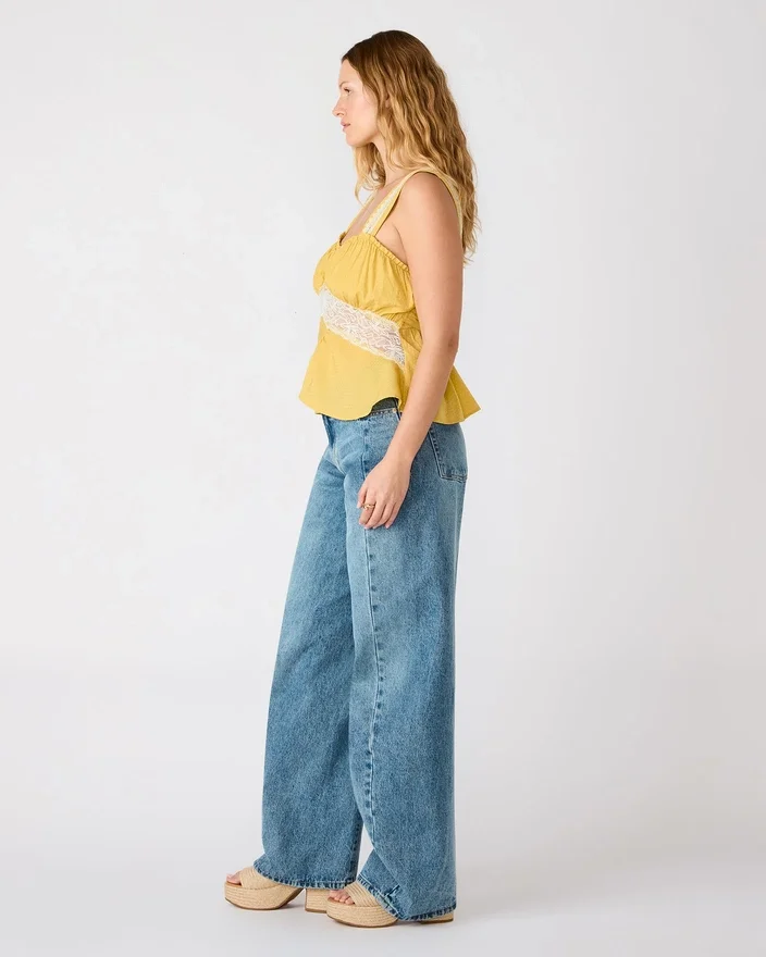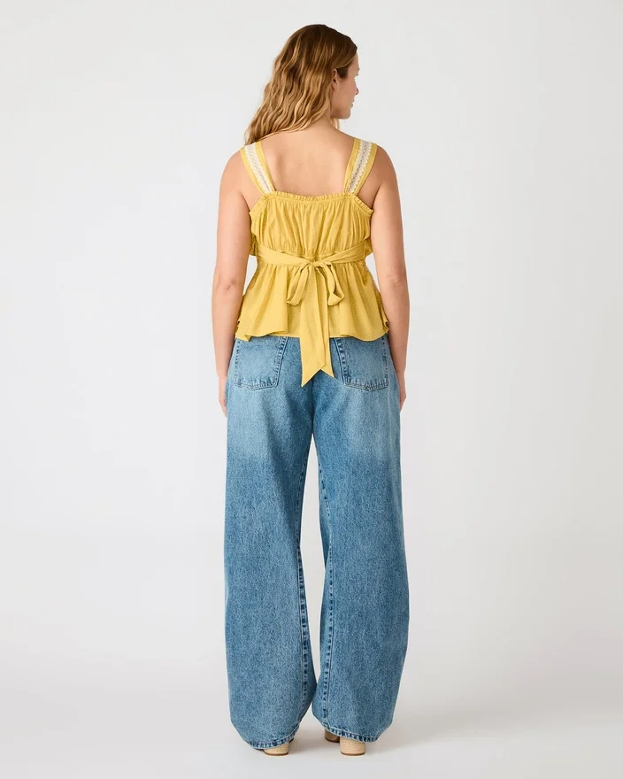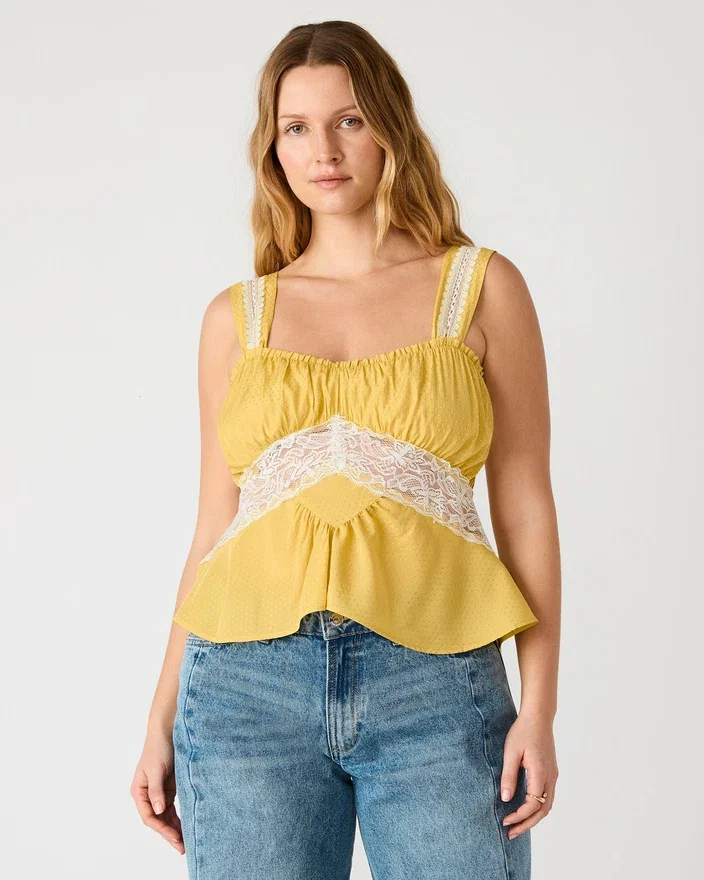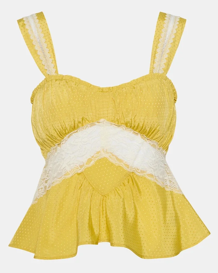 Cinthia-toppen i Golden Lime ger en avslappnad elegans med sin ärmlösa silhuett och matchande setdesign. Delikata spetsdetaljer tillför en raffinerad textur, medan en elegant rosett pryder ryggen för en distinkt finish.
