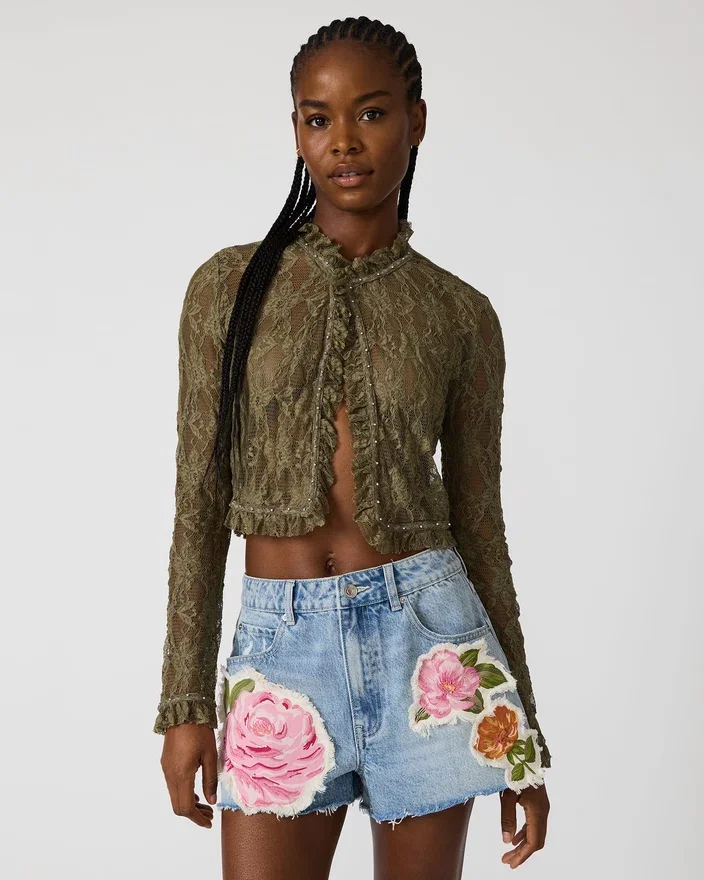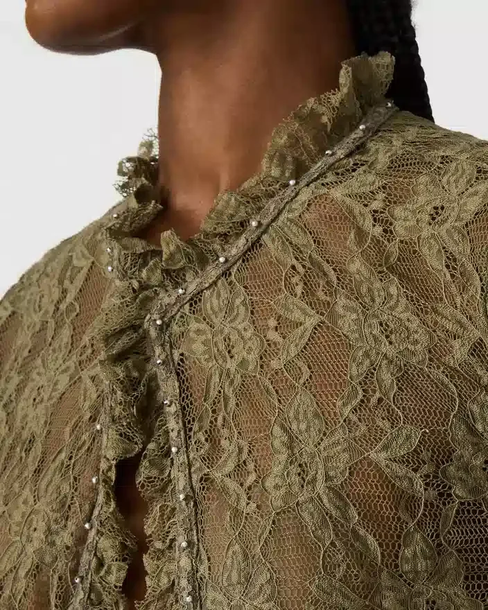 Linden Top Mountain Green kombinerar avslappnad elegans med trendiga detaljer. Den genomskinliga spetsen ger en delikat, romantisk känsla, medan knäppningen framtill gör den lätt att styla på olika sätt. Nitarna ger en oväntad kant, vilket gör denna topp perfekt att bära både i lager-på-lager-looken eller ensam. Perfekt för en kväll på stan eller för en vardagsstil med dina favoritjeans.