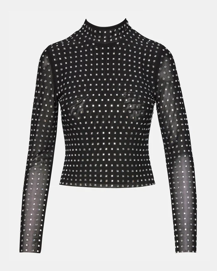 Melvina-toppen är ett sofistikerat och mångsidigt val för alla garderober. Med en elegant mock neck och långa ärmar erbjuder denna topp både täckning och stil. Det delikata, genomskinliga nätmaterialet tillför en touch av elegans, medan de fyrkantiga strassdekorationerna ger en subtil men glamorös touch.