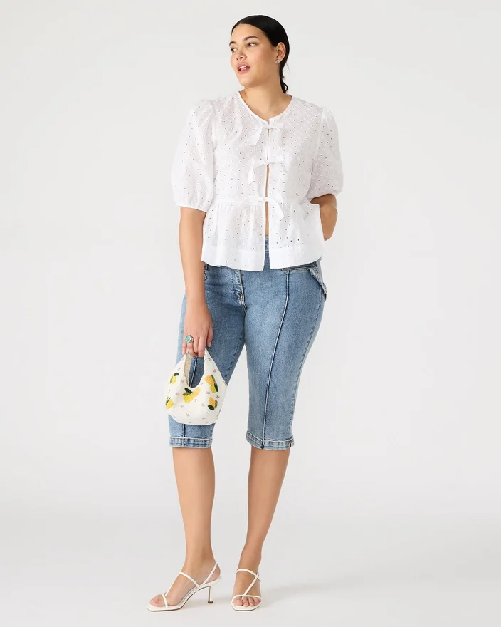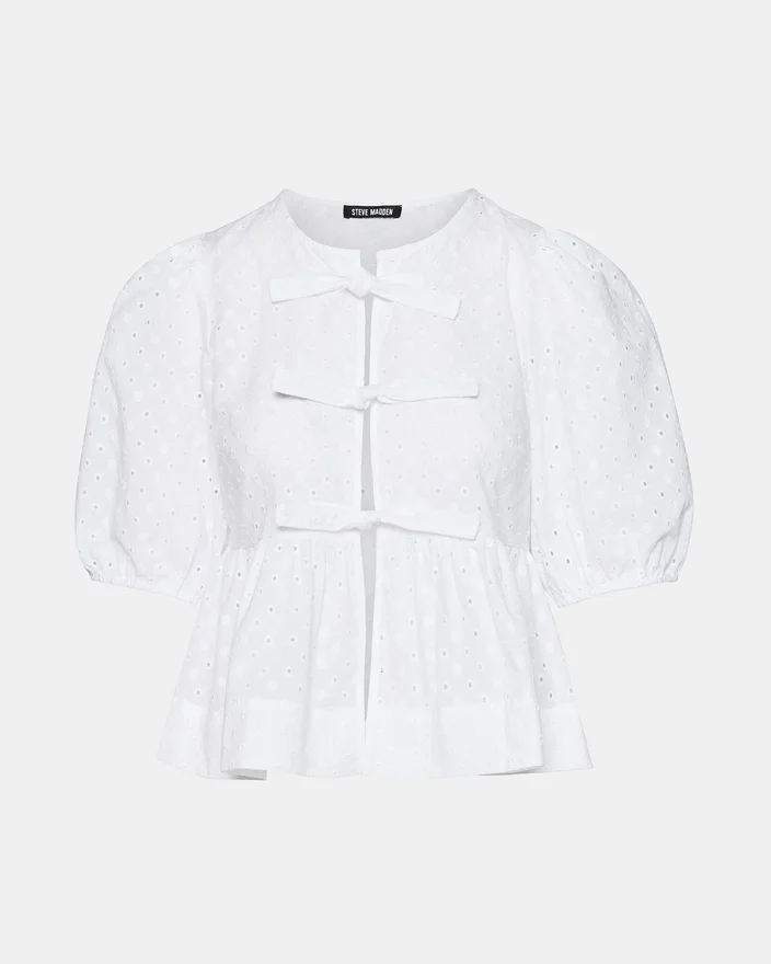 Paula-toppen har snygga korta puffärmar och en knytning framtill, accentuerad av fina hålbroderier. Denna topp ger en chic, modern look som passar perfekt för alla tillfällen.