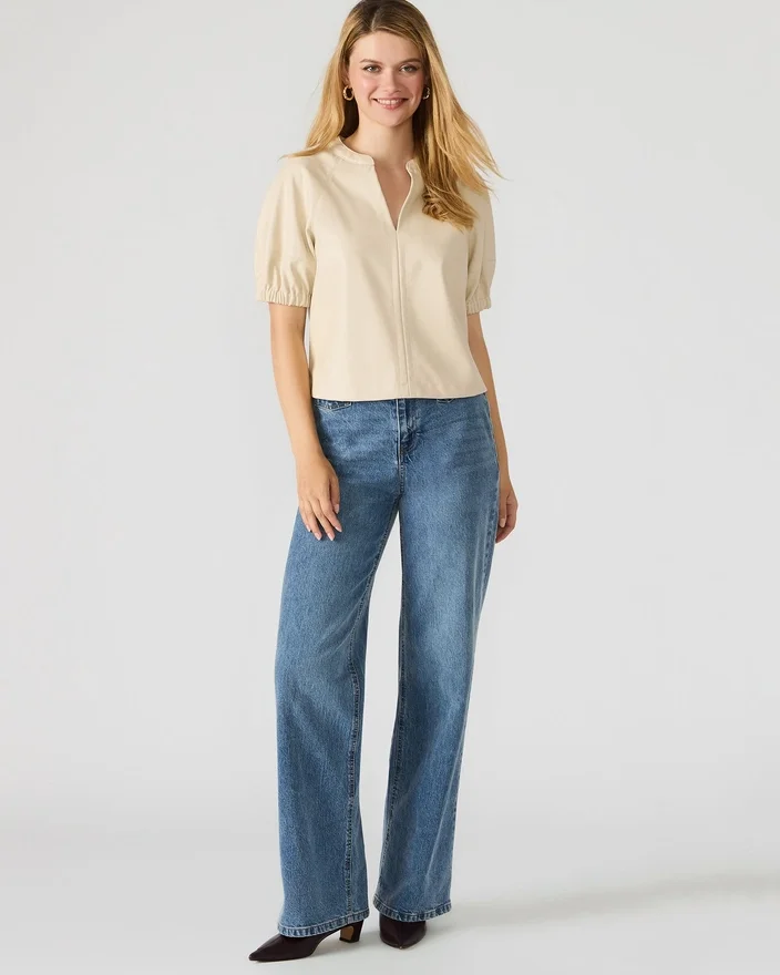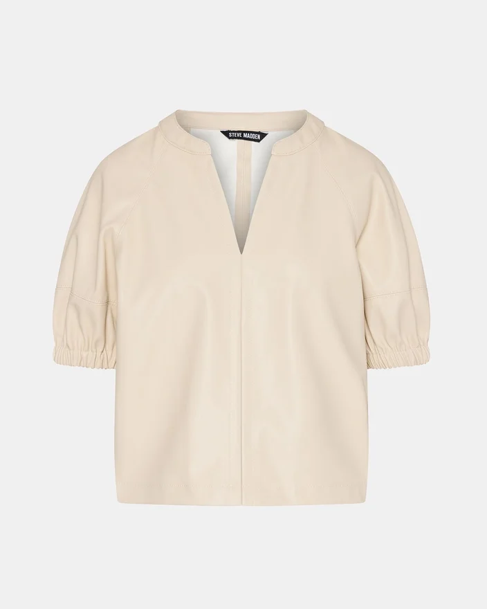 Förhöj din garderob med Roxanne-toppen, med korta puffärmar tillverkade av lyxigt konstläder. Detta skickligt designade plagg kombinerar en kantig textur med en smickrande silhuett, perfekt för att göra ett sofistikerat intryck i alla sammanhang.