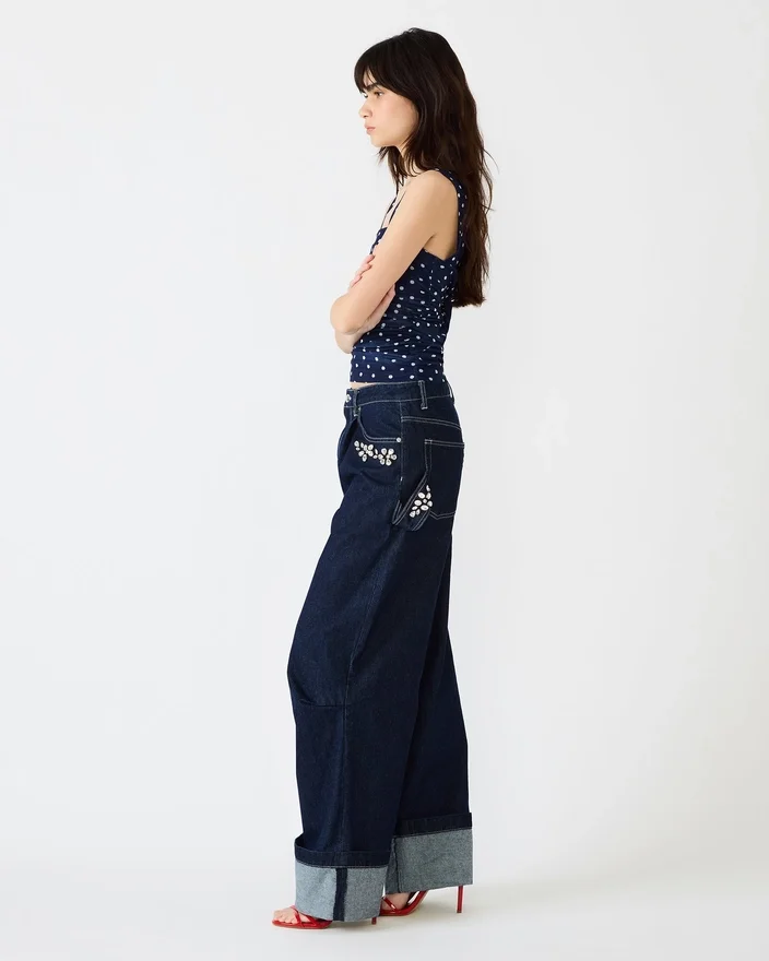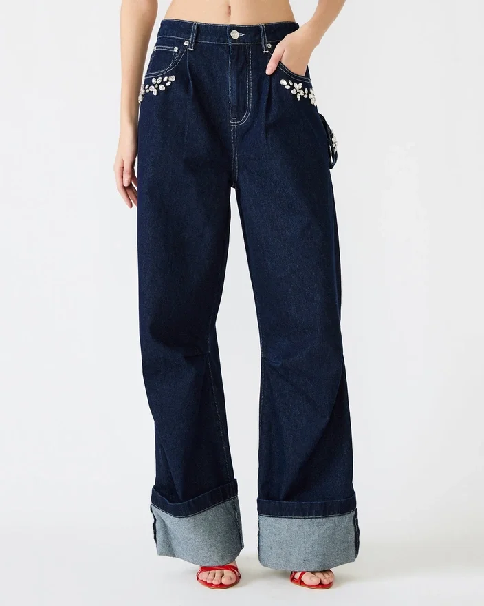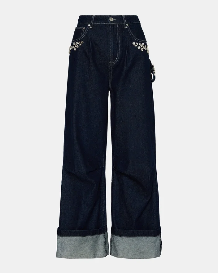 Lyft din denimstil med Bobbie Jean Bijou Blue. Dessa vidbyxor i denim har vackra strassdetaljer som fångar ljuset vid varje steg och ger en touch av glamour till din vardagslook.