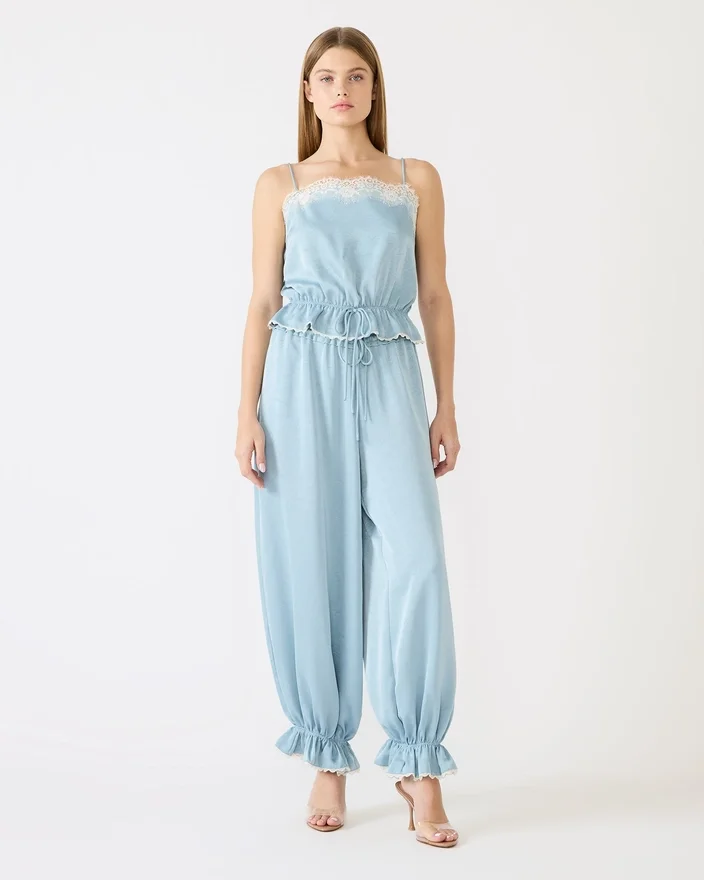Roan Pant Dusty Blue kombinerar en modern silhuett med funktionell design. Dessa fallskärmsbyxor har en distinkt knytning framtill som skapar en raffinerad, justerbar passform samtidigt som den avslappnade estetiken i stilen bibehålls. Det strukturerade tyget faller elegant och ger full rörelsefrihet. Dessa byxor är perfekta både som enskilt plagg och som del av ett matchande set, och passar lika bra i vardagsstil som till fest. Den dammiga blå nyansen ger mångsidiga stylingmöjligheter i hela din garderob.