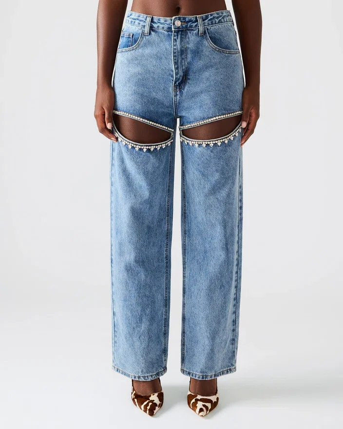 Taylor-jeansen erbjuder en stilfull twist på en klassisk design. Med sin vida passform ger dessa jeans komfort och mångsidighet, medan de intrikata utskärningarna med strass på låren tillför en touch av glamour.