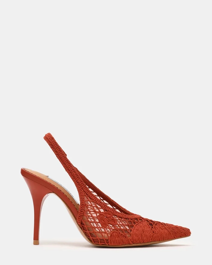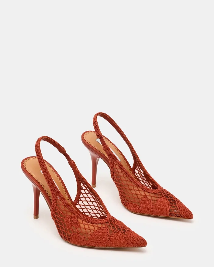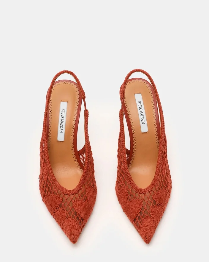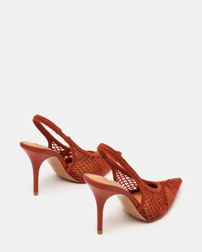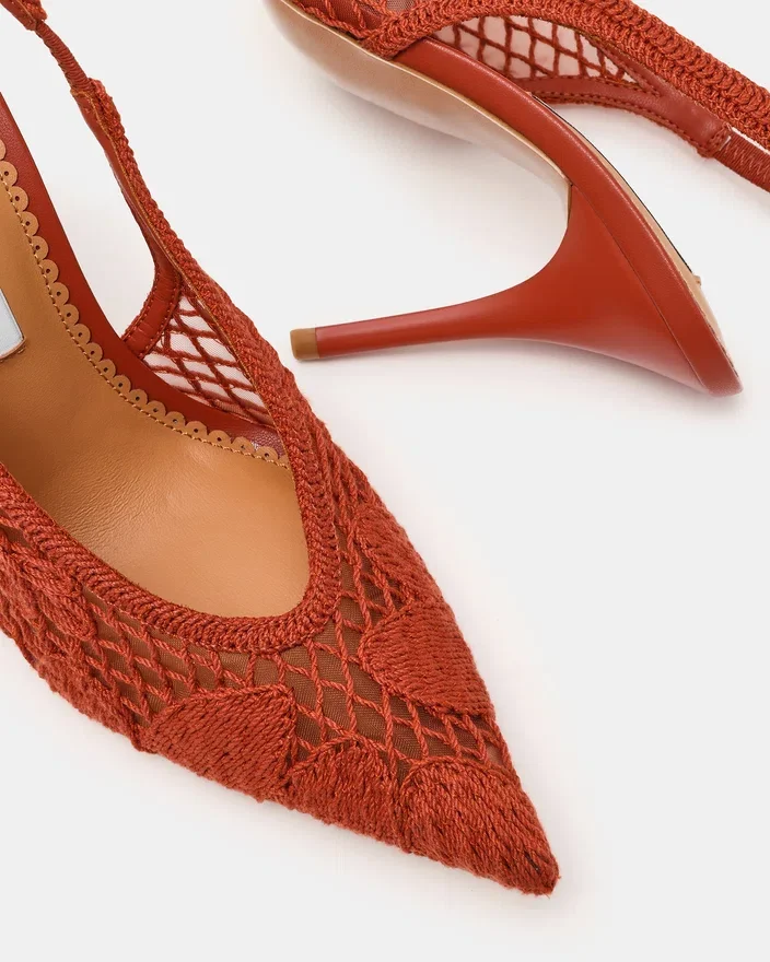 Vi presenterar Andromeda Crochet Terracotta-klackskorna. Denna eleganta klack har en spetsig tå och stilettklack för en sofistikerad look. Slingbacks-remmen ger en säker passform medan den unika designen tillför en touch av lyx. Perfekt för alla formella tillfällen, dessa klackskor lyfter din outfit till nästa nivå.