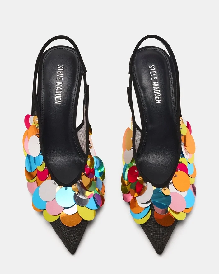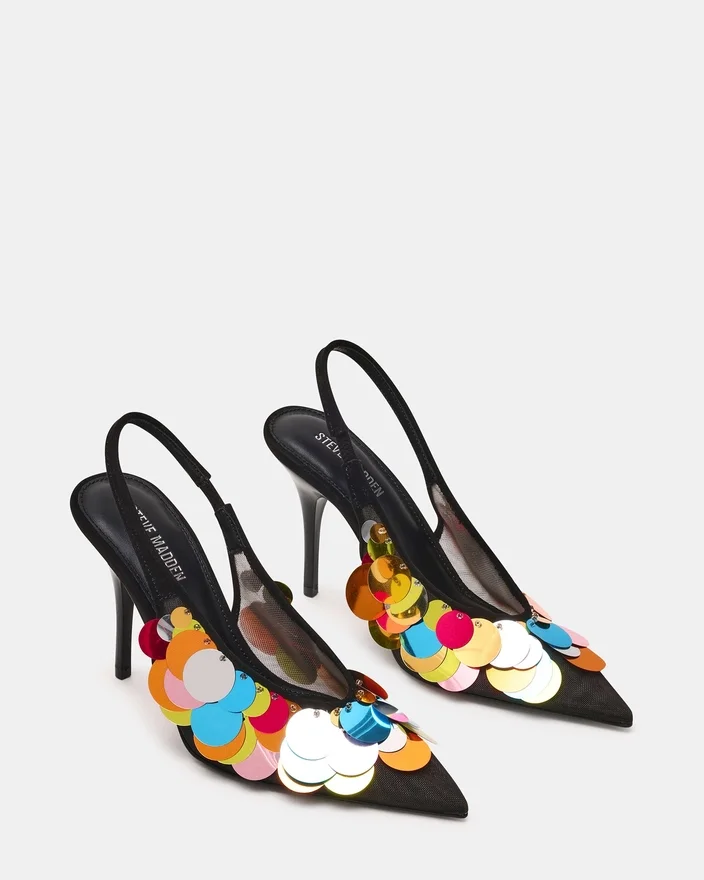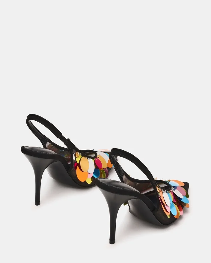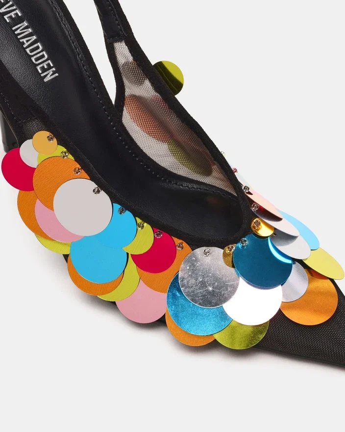 Avid Black Mesh-pumpsen kombinerar livfulla, mångfärgade paljetter med ventilerande mesh, vilket skapar en slående visuell kontrast. Den spetsiga tådesignen ger en elegant silhuett, medan remmen bakom hälen säkerställer en säker och bekväm passform. Denna klack, som perfekt kombinerar stil och sofistikation, lyfter vilken outfit som helst med en distinkt finish.