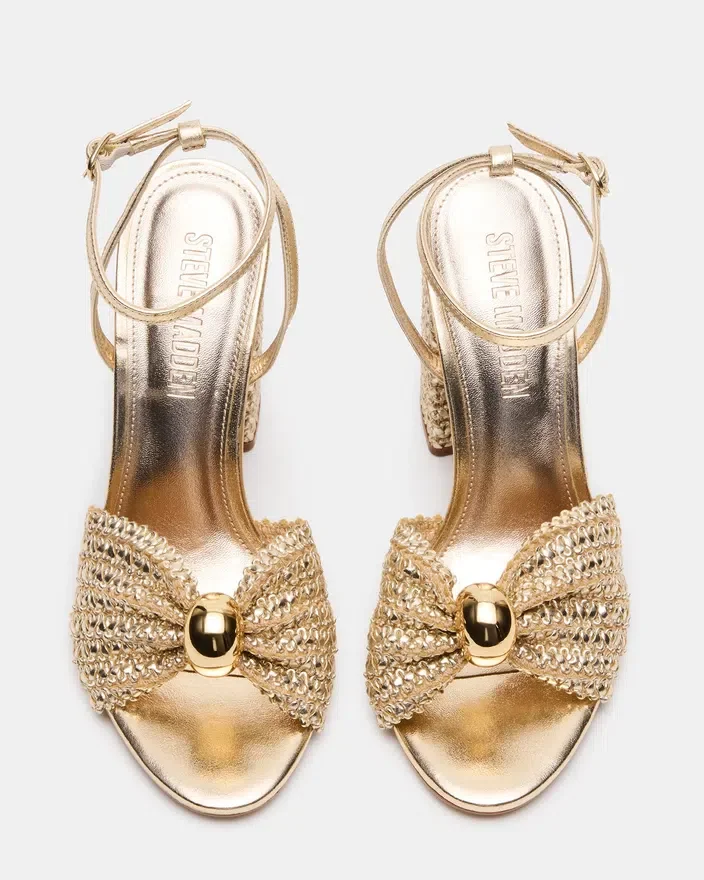 Cheyla Gold-sandalen har en stilfull raffia-klackskor i kombination med en stadig blockklack för komfort hela dagen. Sandalen kompletteras med en säker ankelrem och erbjuder både mode och funktion. Förhöj din sommargarderob med denna mångsidiga och eleganta sko.