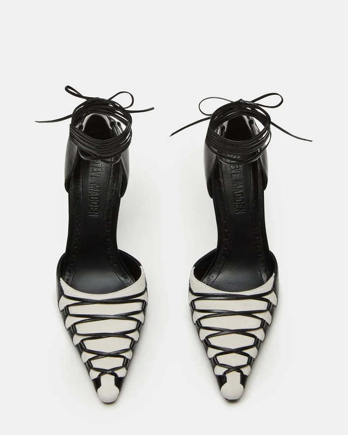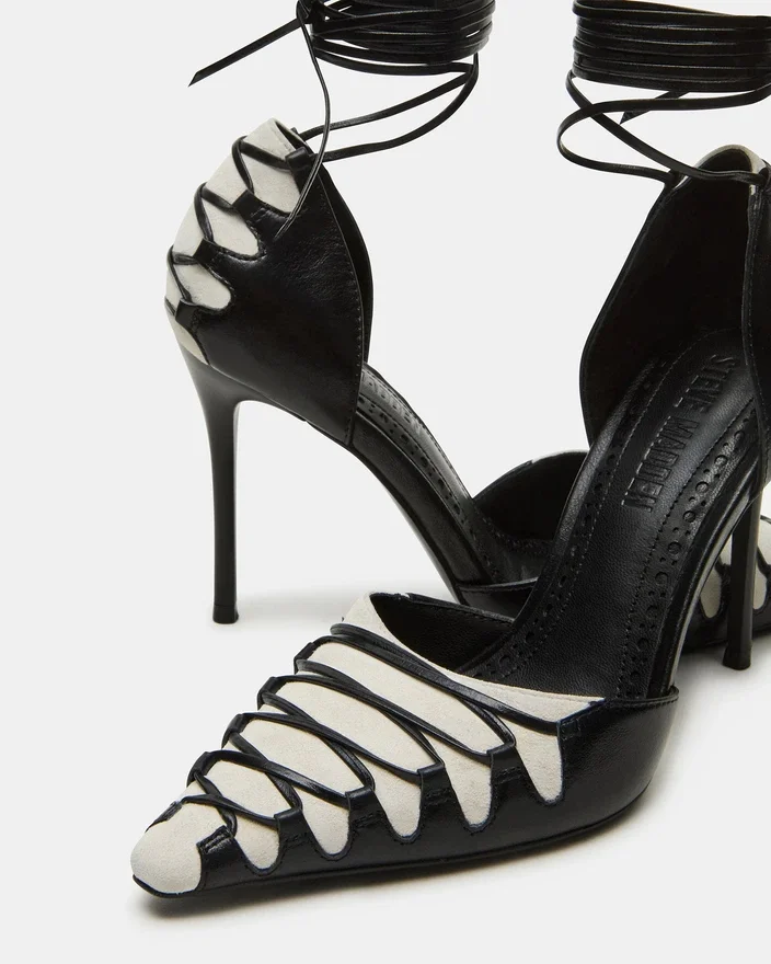 Danger är en stilfull och sofistikerad pump med spetsig tå och stilettklack. Den unika designen med remmar och snörning tillför en touch av elegans till vilken outfit som helst. Med sin eleganta silhuett och bekväma passform är denna sko perfekt för alla modemedvetna personer som vill göra ett statement.