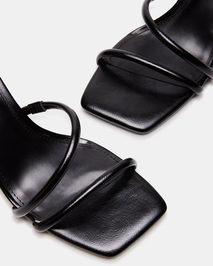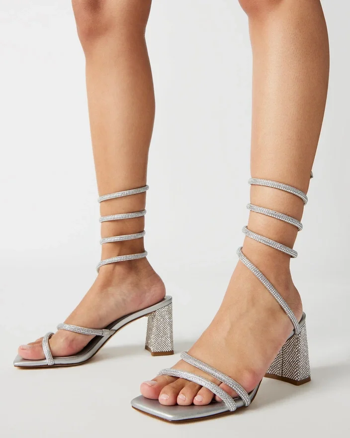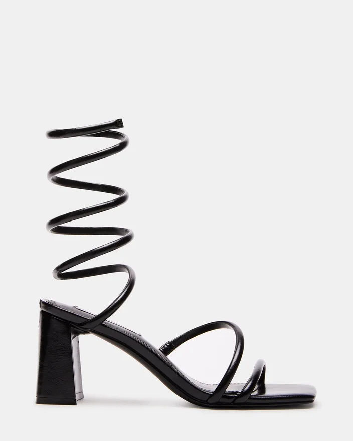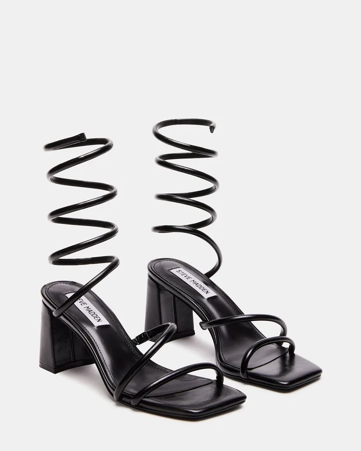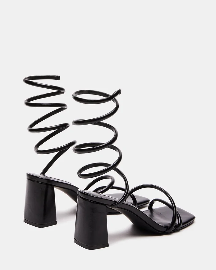 Tredimensionella rörformade remmar som korsas över foten och lindas runt vristen fäster Lopez-sandalen vid en fyrkantig tå och en klack med blockform.