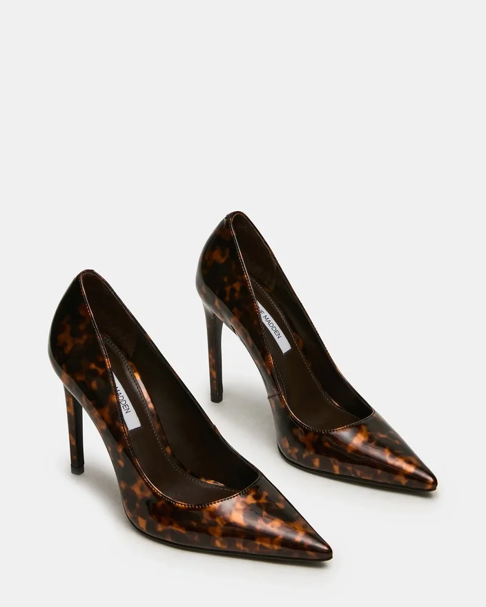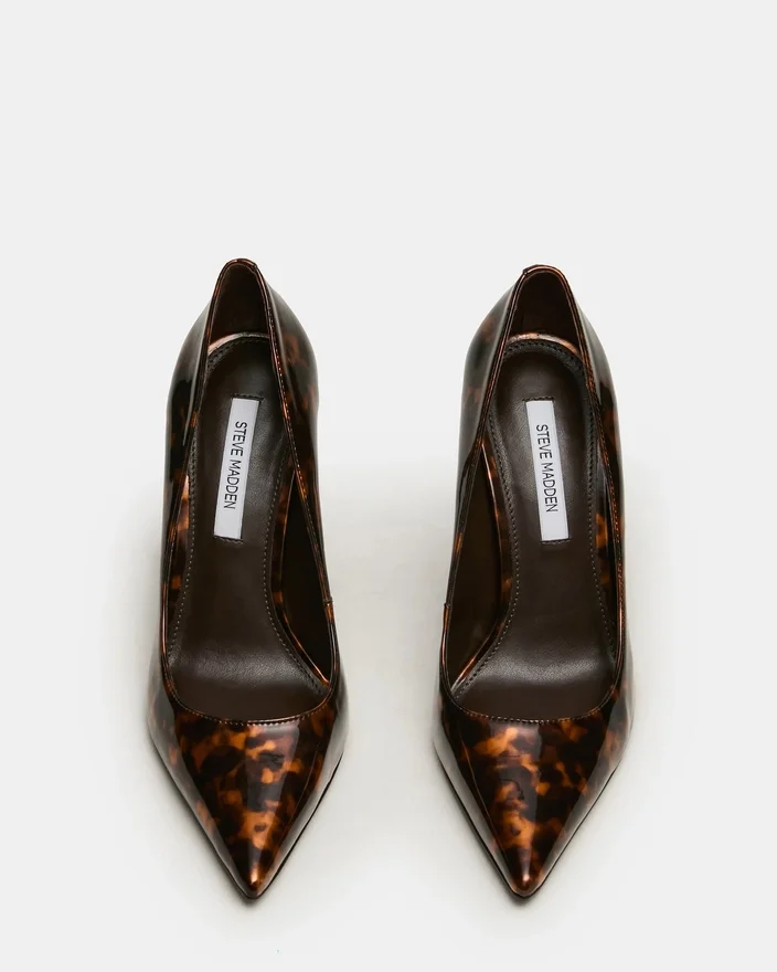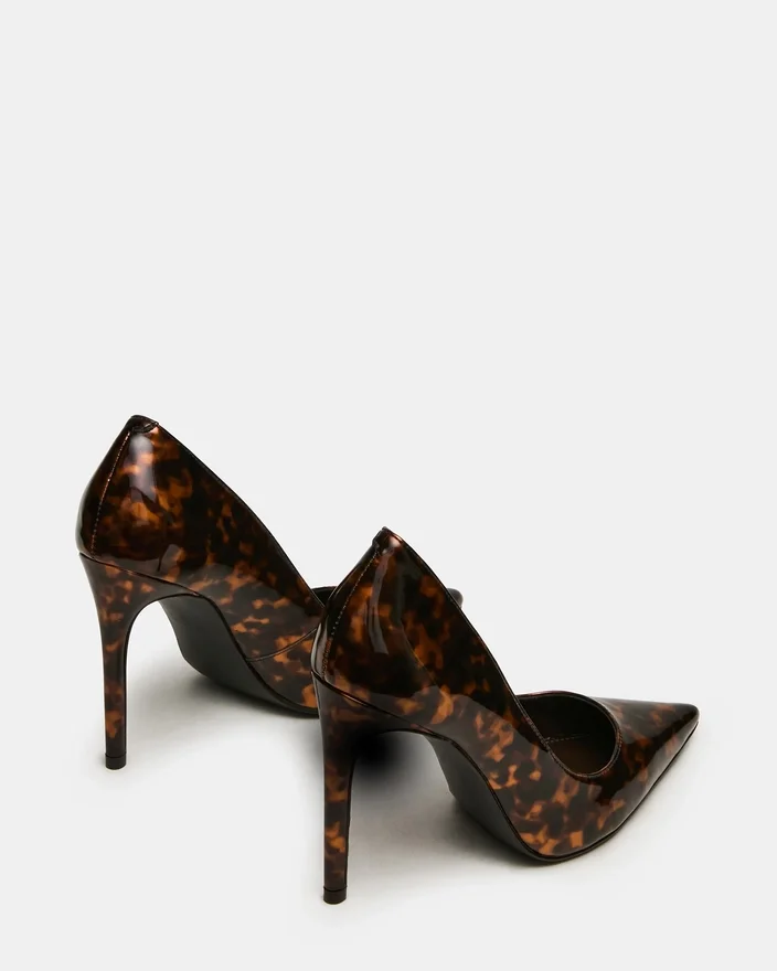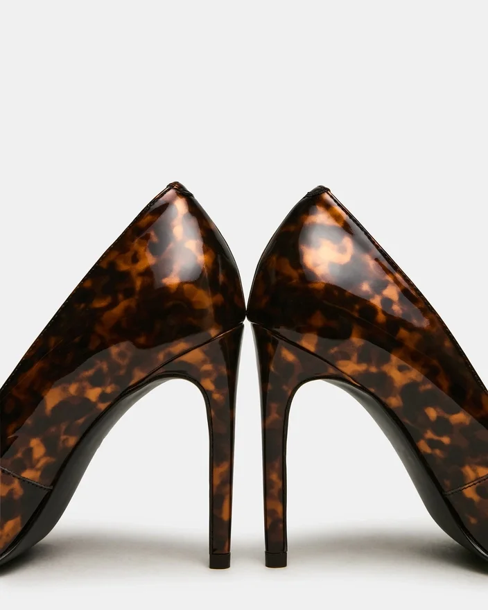 Dessa Noir Tortoise-pumps är tillverkade av lyxiga material och ger en touch av elegans till vilken outfit som helst med sin spetsiga tå och stilettklack. Dessa pumps är perfekta för alla tillfällen och erbjuder en tidlös och elegant look som lyfter din stil.