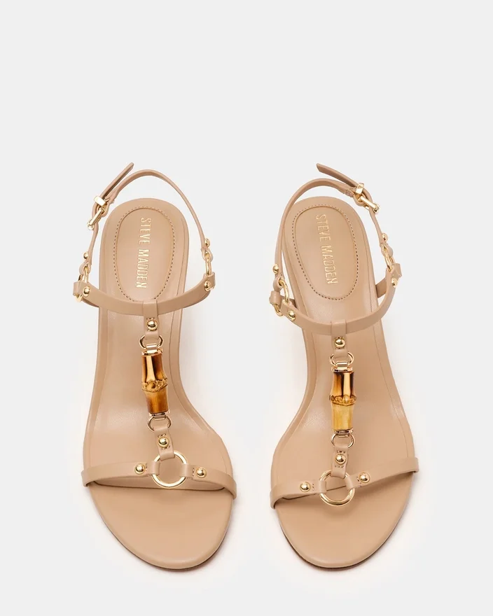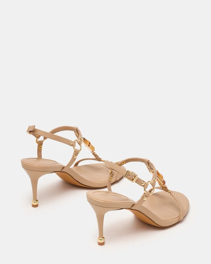 Ronda Taupe kombinerar diskret elegans med iögonfallande detaljer. Denna modell har en delikat bambudekoration i kombination med glänsande gulddetaljer och strategiskt placerade nitar som ger en kantig touch. Den strukturerade klacken ger både höjd och stabilitet, vilket gör den perfekt för övergången från dag till kväll. En mångsidig sko som balanserar sofistikation med modern attityd.