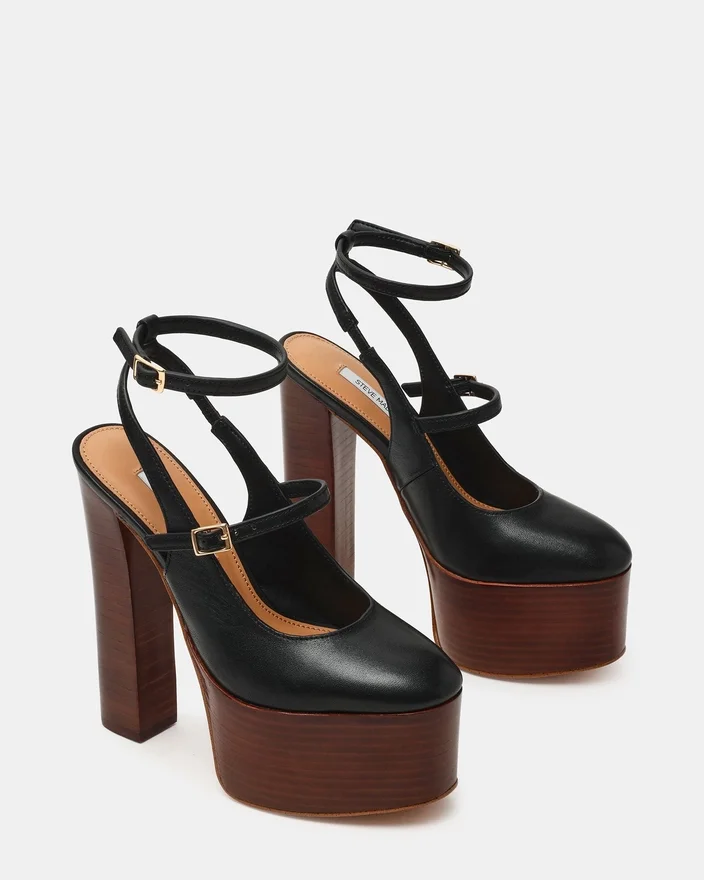 Lyft din stil med Scotlyn Stacked Black Leather Klackskor. Med en remdesign och en platåskor erbjuder dessa klackskor både komfort och en chic look. Ankelremmen ger extra stöd och stabilitet. Dessa sandaler är perfekta för alla tillfällen och ett måste i din garderob.