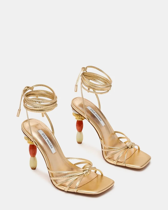 Solena Gold är en remsko med en skulpterad silhuett och en arkitektonisk fyrkantig tå. Designen med snörning runt benet skapar en elegant, justerbar passform som smickrar vristen samtidigt som den erbjuder mångsidiga stylingmöjligheter. Den raffinerade klackkonstruktionen ger säkert stöd och en elegant estetik som passar både festliga tillfällen och en modern garderob.
