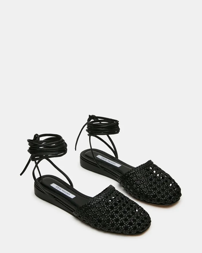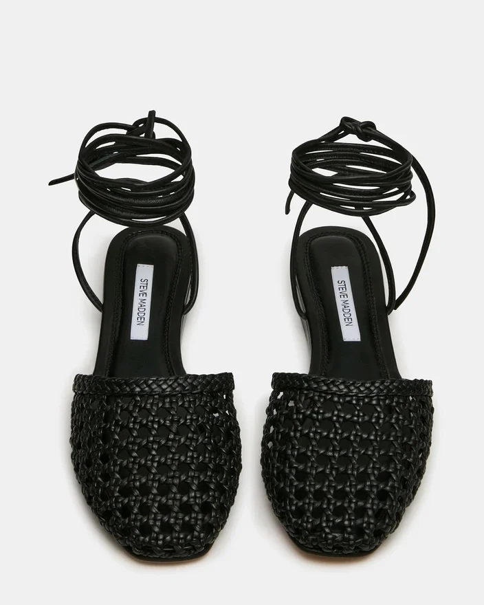 Flutter Black Leather Flat utstrålar diskret elegans genom sin unika design. Den vävda konstruktionen ger visuellt intresse och andningsförmåga. De karakteristiska benbanden – ett utmärkande drag – skapar en arkitektonisk silhuett.