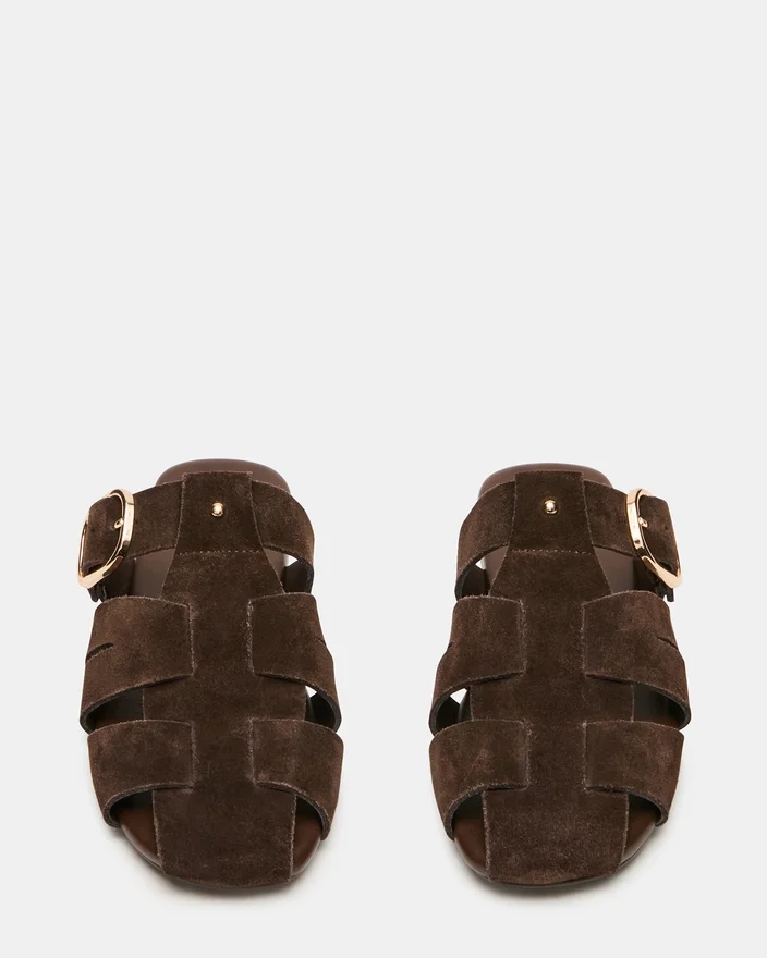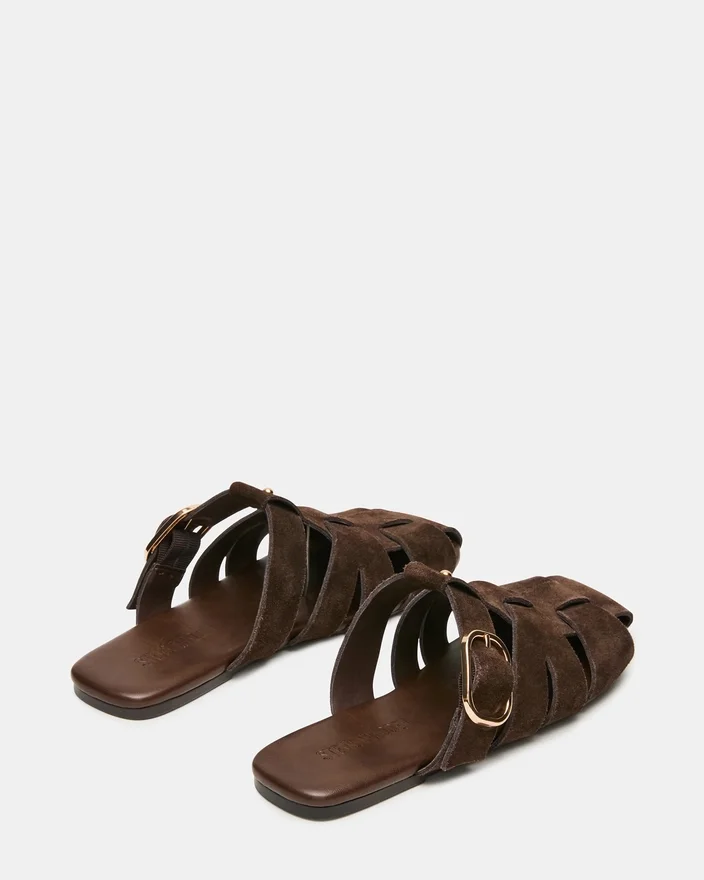 Halo Brown Suede har en distinkt fiskarstil med ett burliknande mönster som ger visuellt intresse och stöd. Den justerbara spännen gör att du kan anpassa passformen, medan den platta sulan håller dig bekväm hela dagen. Denna mule-modell är lätt att ta på utan att kompromissa med stilen, vilket gör den till ett mångsidigt tillskott till vilken garderob som helst.