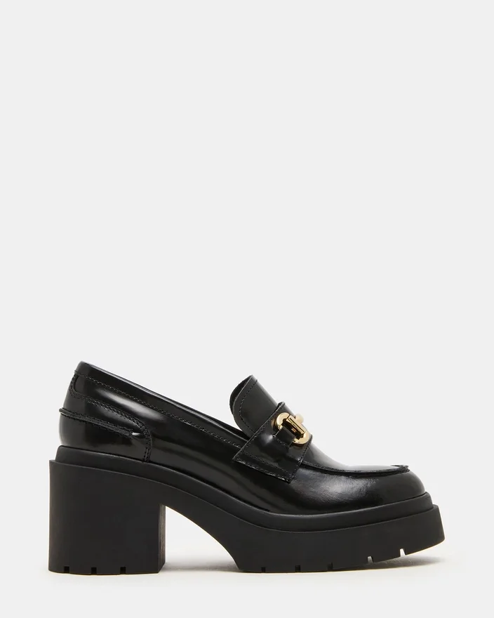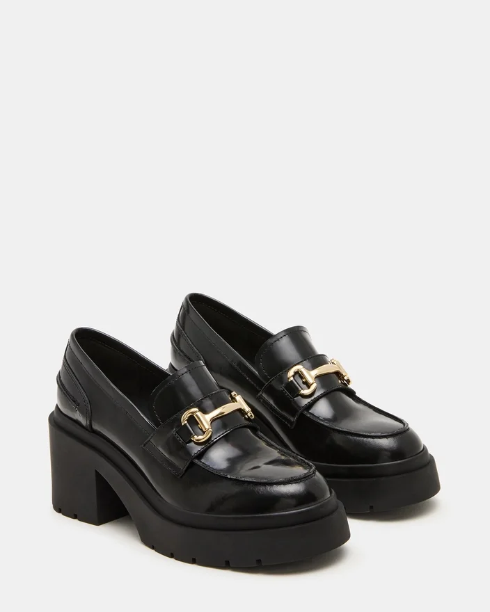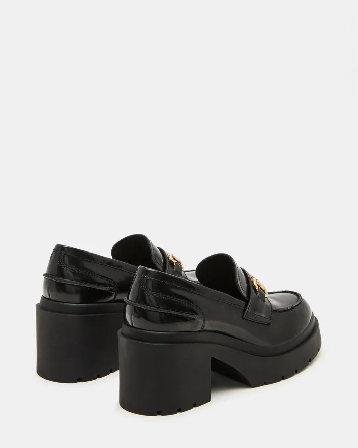 Lazra Black Loafer kombinerar tidlös stil med modern funktionalitet. Med en grovmönstrad plattformssula och en stadig blockklack erbjuder denna sko förbättrad stabilitet och grepp för komfort hela dagen. Skapad för en elegant men ändå kantig look lyfter den vilken outfit som helst samtidigt som den ger pålitligt stöd, vilket gör den till ett oumbärligt tillskott till en raffinerad garderob.