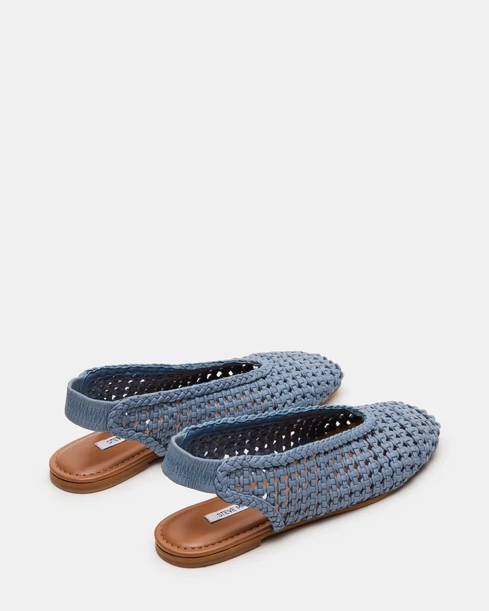 Rumi Blue Leather Flat visar upp ett distinkt hantverk med sin intrikat vävda ovandel och graciösa rundade tåprofil. Slingbacks-remmen ger en säker passform samtidigt som skons minimalistiska estetik bibehålls. Denna mångsidiga design är det perfekta valet för personer som värdesätter både elegans och praktiskhet i sina vardagsskor.