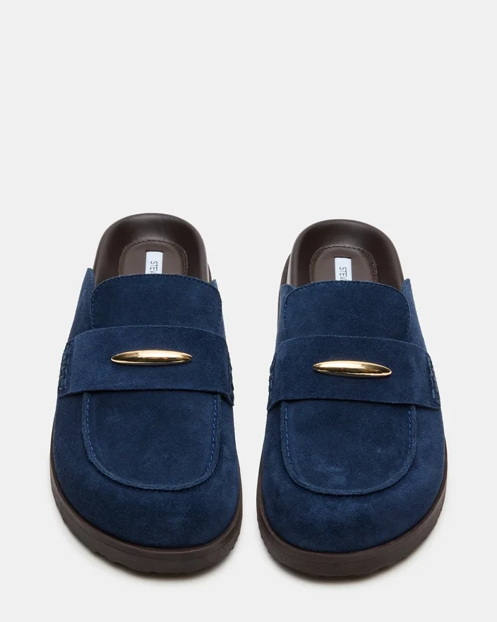 Tobin Navy Suede Slip-On Mule Flat erbjuder expertis i hantverket med en slät yta och en bekväm design. Den mångsidiga silhuetten garanterar komfort utan att kompromissa med stilen, vilket gör den idealisk för både vardagsstil och arbete. Den platta sulan ger stabilt stöd, perfekt för att ha på sig hela dagen.