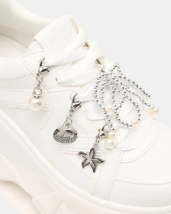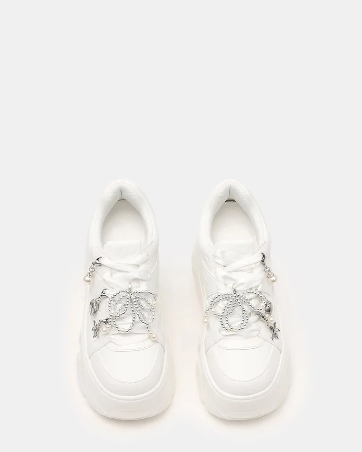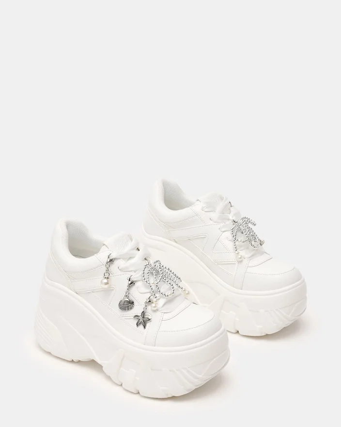 Fifi White är en djärv, klumpig platåskor som drar blickarna till sig med sin rejäla sula och moderna silhuett. Denna snörningsdesign erbjuder en säker, anpassningsbar passform, medan den iögonfallande platåskorna ger omedelbar höjd till alla vardagsstils outfits. Personifiera din look med de medföljande berlockerna, som låter dig uttrycka din individuella stil och förnya sneakerens utseende när du vill.
