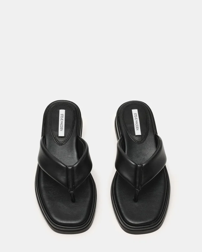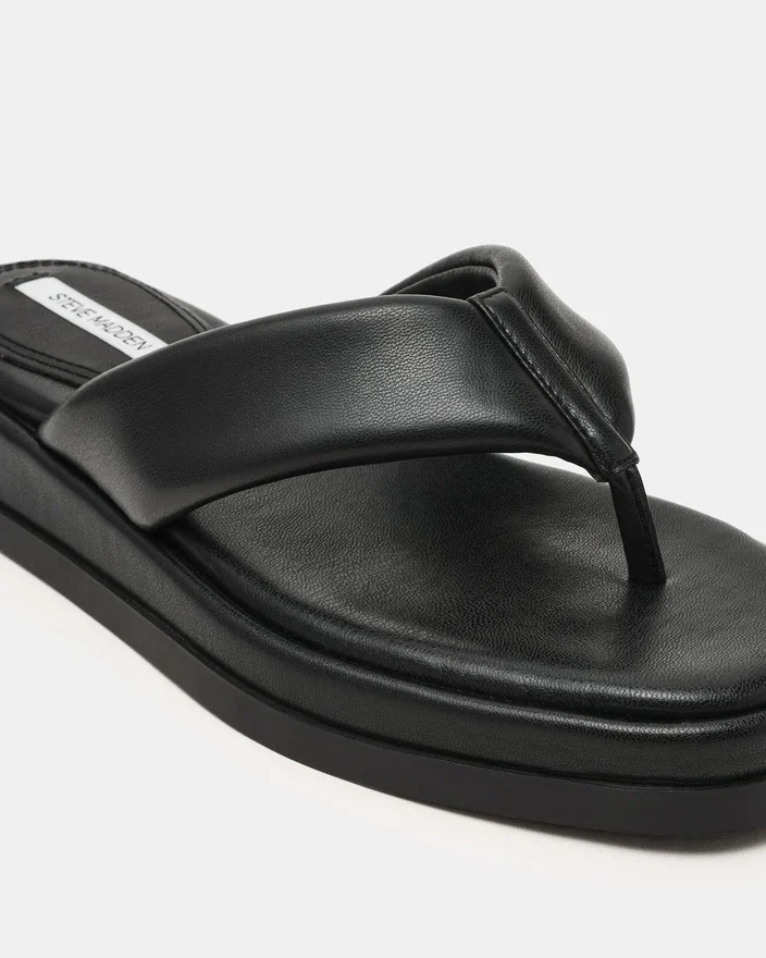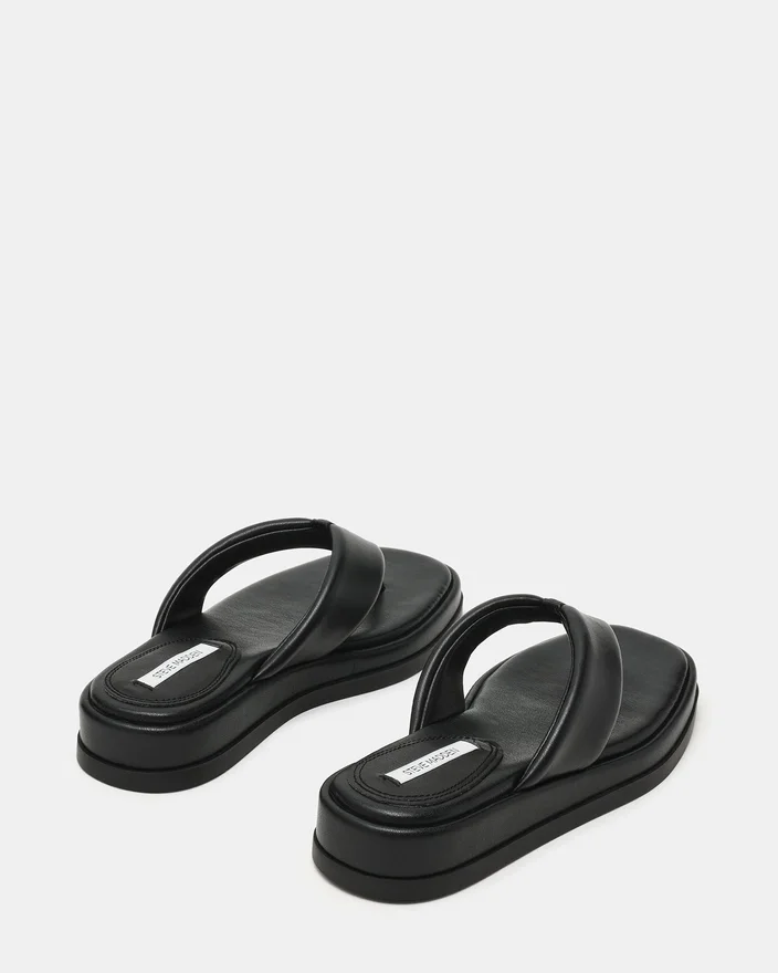 Bella Black-plattformssandal med tårem visar upp raffinerad minimalism genom sin slående silhuett med fyrkantig tå och plattformssula. Denna modell lyfter den klassiska tåremkonstruktionen med moderna proportioner och skapar en sko som drar blickarna till sig utan att kompromissa med bekvämligheten.
