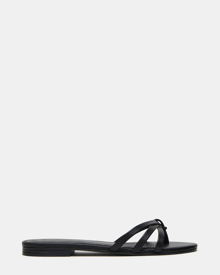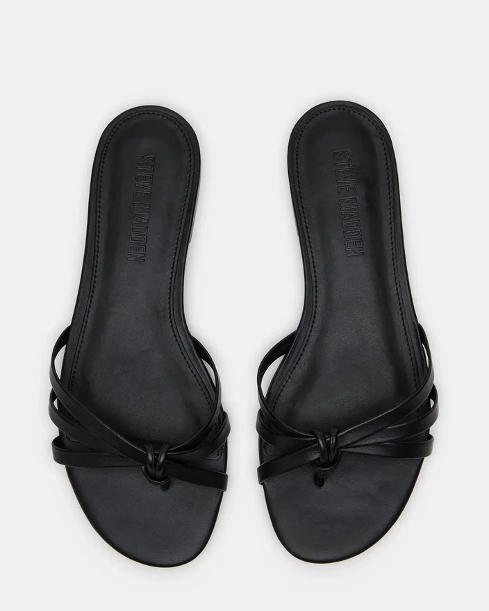 Calissi-sandalerna i svart läder är tillverkade av lyxiga material och har en elegant remdesign och en bekväm platt sula. Dessa slip-on-sandaler är perfekta för alla tillfällen och lyfter din outfit samtidigt som de ger komfort hela dagen.