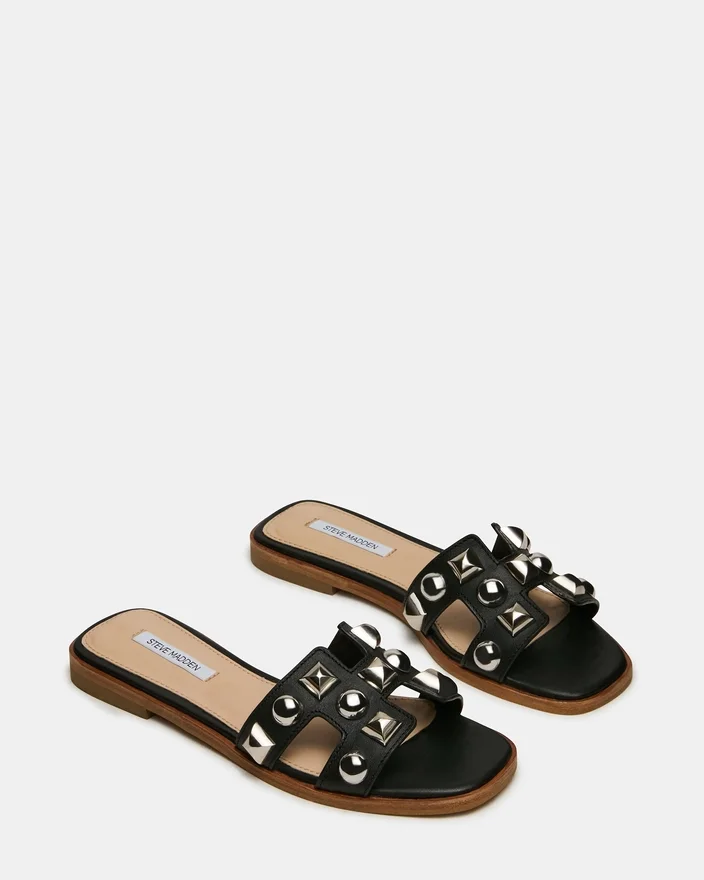 Geometriska utskärningar på den breda remmen på Hadyn Studs svarta lädersandal ger denna platta sandal en fräsch känsla.