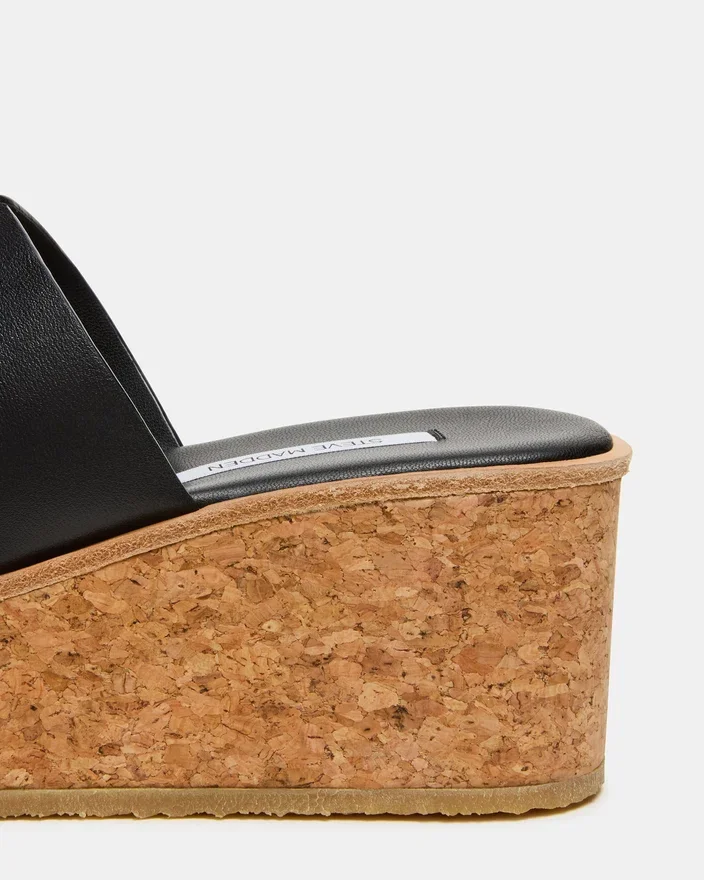 Harmony Black Leather Wedge Sandal har en platåskor i kork som ger både stil och komfort för hela dagen. Den strukturerade kilklacken ger stabilt stöd utan att kompromissa med elegansen. Ett mångsidigt val för övergången från vardagsstil till festligare tillfällen.