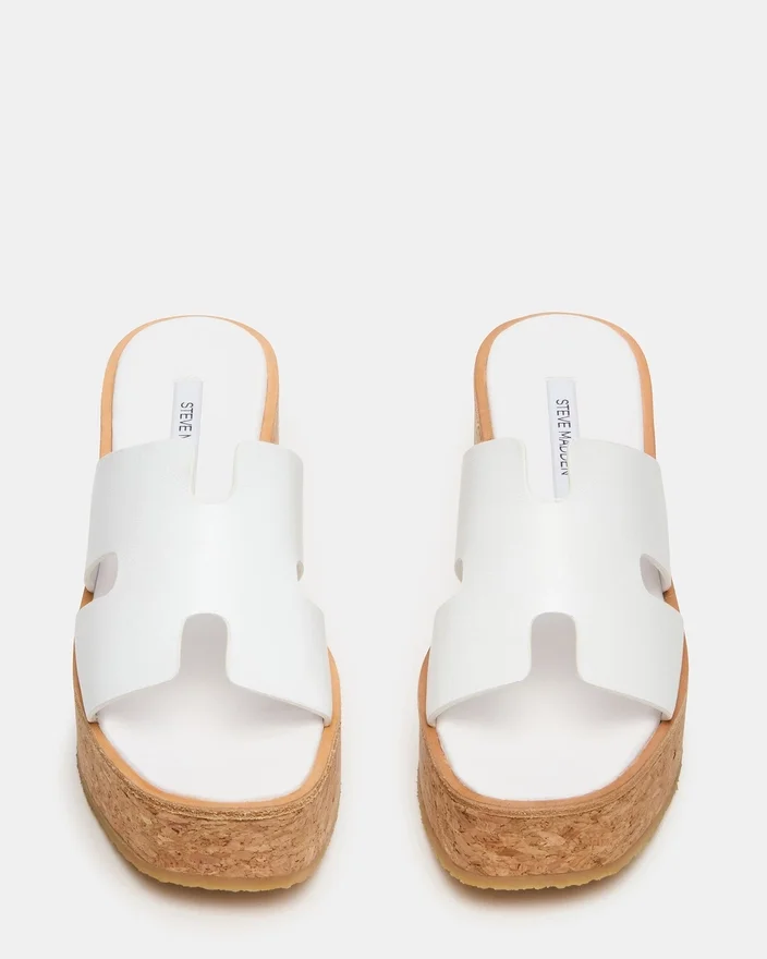 Harmony White Leather Wedge Sandal har en platåskor i kork som ger både stil och komfort för hela dagen. Den strukturerade kilklacken ger stabilt stöd utan att kompromissa med elegansen. Ett mångsidigt val för övergången från vardagsstil till festligare tillfällen.