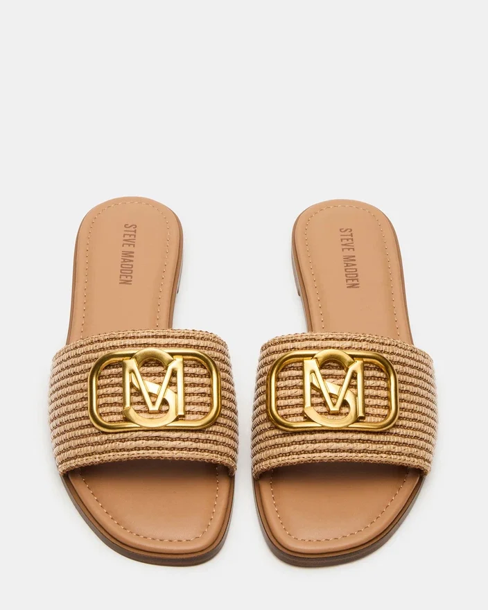 Lyft din vardagsstil med Kora Natural Raffia-sandal, skickligt tillverkad av naturlig raffia för andningsbar komfort. Den eleganta silhuetten har raffinerade gulddetaljer som ger en subtil touch av elegans till vardagsgarderoben. Perfekt för en avslappnad stil, denna sandal kombinerar naturliga texturer med en polerad yta.