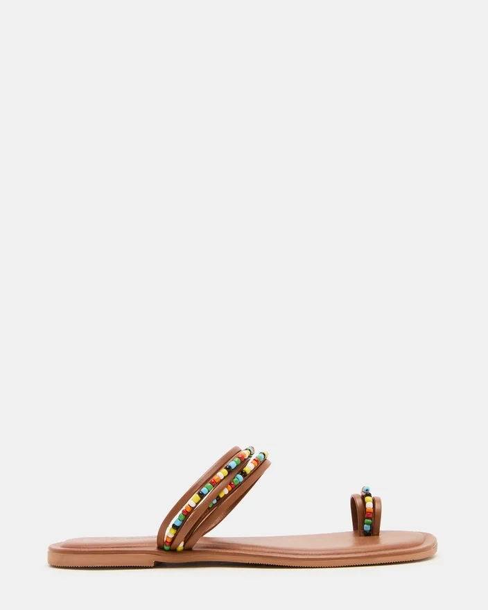 Sandaler Nabila Tan Multi har en distinkt fyrkantig tådesign som kompletteras av en rad flerfärgade pärlor, vilket ger en raffinerad och konstnärlig touch till din sommarskor-kollektion. De omsorgsfullt utformade detaljerna förstärker både stil och komfort, vilket gör den till ett perfekt val för dig som uppskattar skickligt hantverk i kombination med livfull stil.