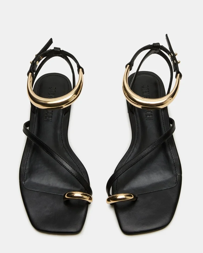 Odyssey-sandalen erbjuder både stil och komfort med sin remdesign, fyrkantiga tåform och ankelrem med guldfärgade detaljer. En elegant tåring ger en touch av elegans. Perfekt för en dag ute eller en kväll på stan.