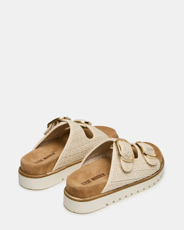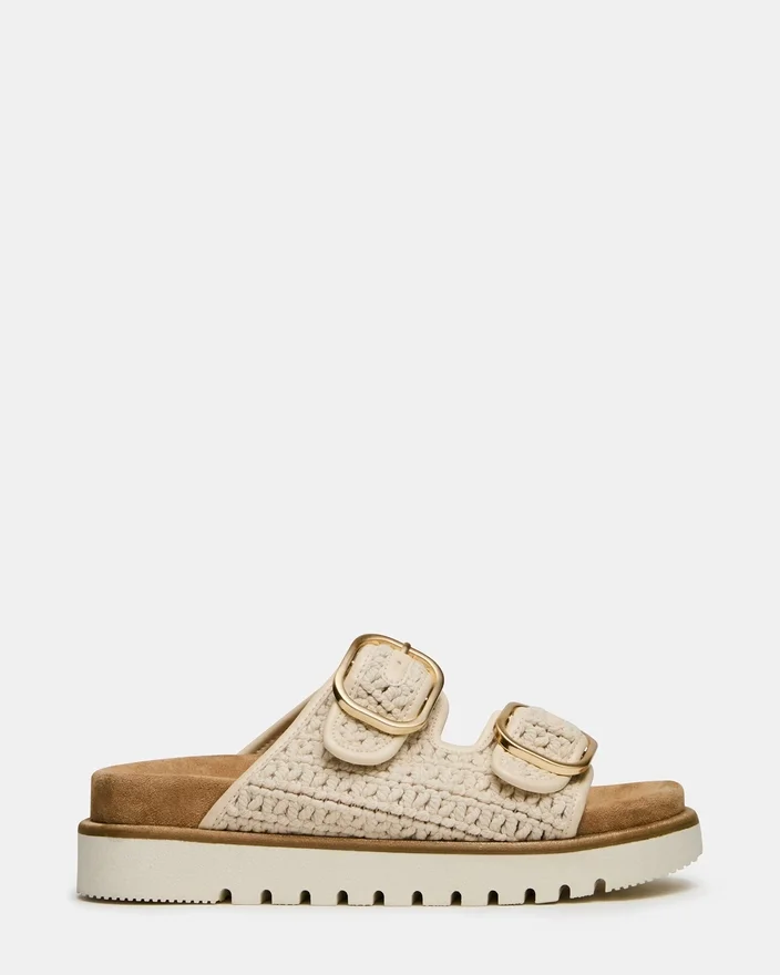 Shellby Cream är en skickligt tillverkad vävd sandal designad för bekvämlighet och stil. Silhuetten har säkra spännen som ger justerbar passform och stabilitet hela dagen. En konturerad fotbädd erbjuder stöd för fotvalvet och dämpning, vilket gör denna mångsidiga sandal idealisk för både vardagsstil och informella tillfällen. Den vävda konstruktionen ger en ventilerande passform som är perfekt för varmt väder.